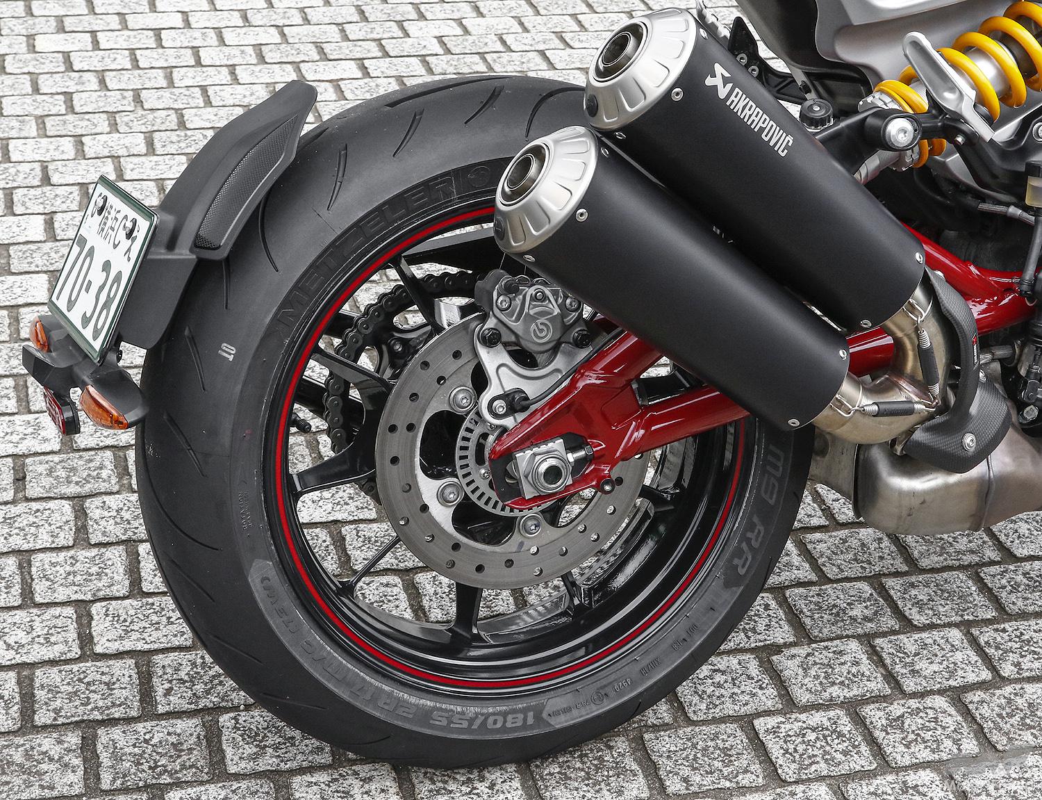 2-into-1-to-2の排気系。一旦集合後のツインマフラーはブラックアウトされたアクラポヴィッチ製。