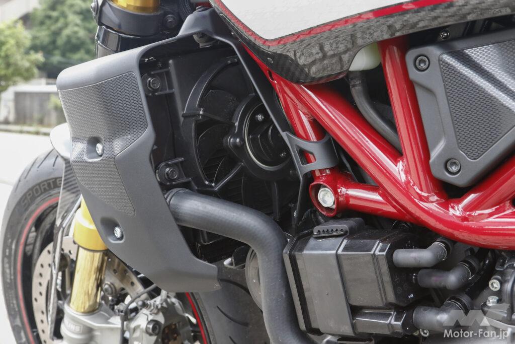 赤いパイプフレームに挟まれる様に吊られた搭載エンジンは、73キュービックインチ(1203cc)の水冷横置きVツイン。スリムさを活用した車体デザインである。