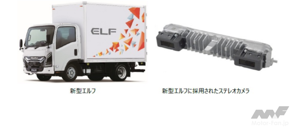 いすゞにおける商用車の豊富な知見により、交差点内右左折時の衝突軽減ブレーキ実現に向けたトラック特有のユースケースの想定と、その対応に必要な仕様設定を日立Astemoが受け、いすゞ向けセンシングシステムの開発が進められた。今回、新型エルフに採用されたステレオカメラによるセンシングシステムには、検知範囲拡大を可能にした120度広角ステレオカメラが用いられている。この広角ステレオカメラをトラックの安全装備として広く採用されるミリ波レーダーの検知情報と連携させ、交差点ブレーキ対応を可能とする新開発の制御ソフトを実装することで、より高精度な広角検知を実現し、交差点や単路における衝突被害軽減ブレーキを可能とするセンシングシステムとなっている。