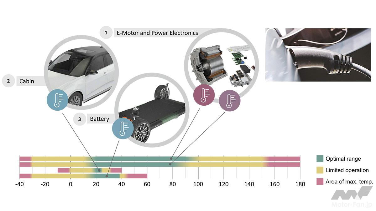上の図は、ドイツ・シェフラーによる、電動アクスル、キャビン、およびバッテリーパックの、それぞれ最適温度帯、限界温度域、最低/最高温度を示すマップ。具体的な温度を示していることから、とても理解しやすい。