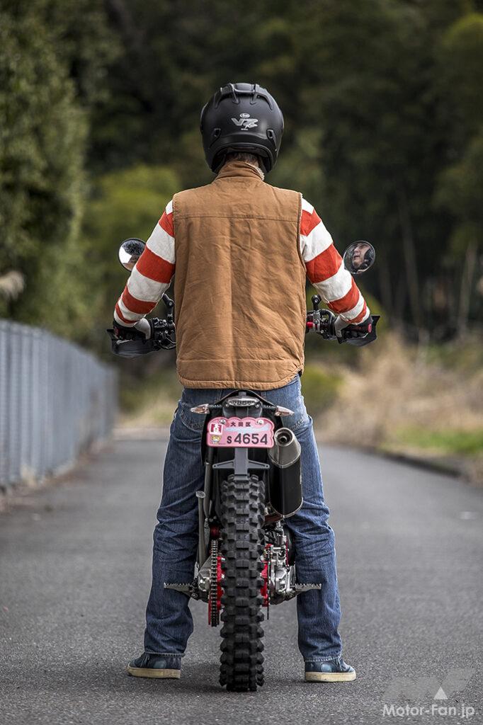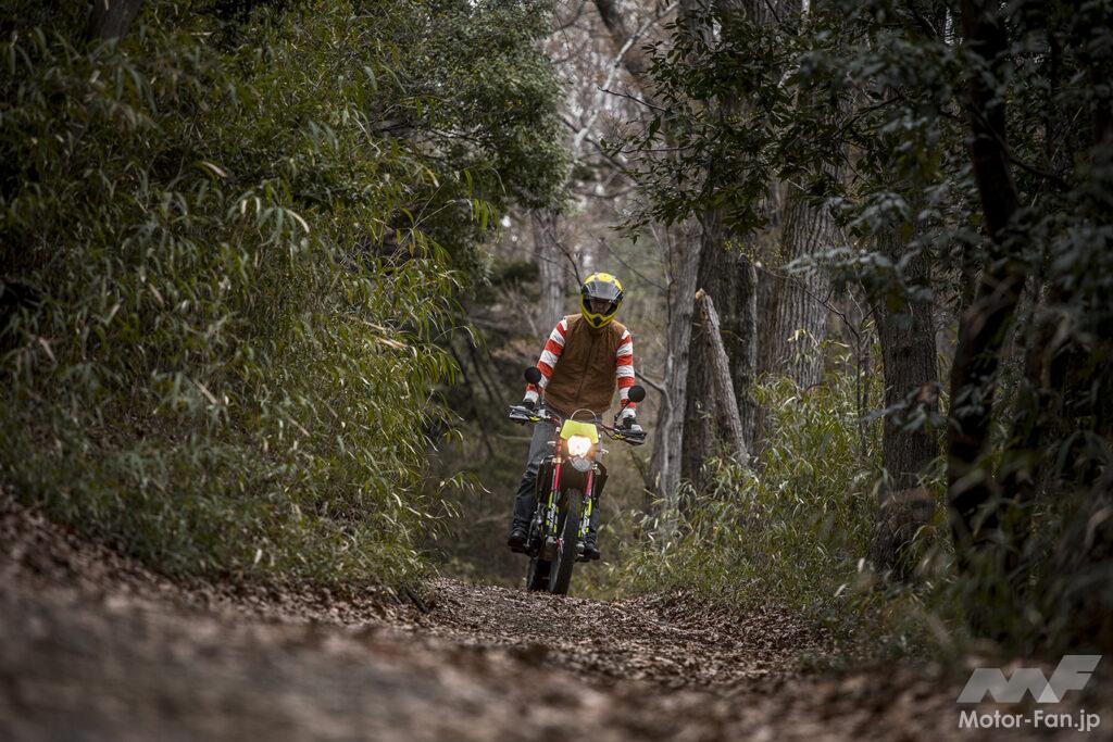 トコトコとフラットな林道を散策するように進むと、車体から受けるコンペ感とは裏腹にのんびり走ることも可能だと実感。125ccながら低速のトルクもあり、登り坂になっても良く粘ってくれた。車高の高さやノンシールチェーンが垂れ角の強いスイングアームにパチャパチャ当たる音などはコンペなのだが、心持ちとしてはセロー的な気分でいられたのが意外だ。