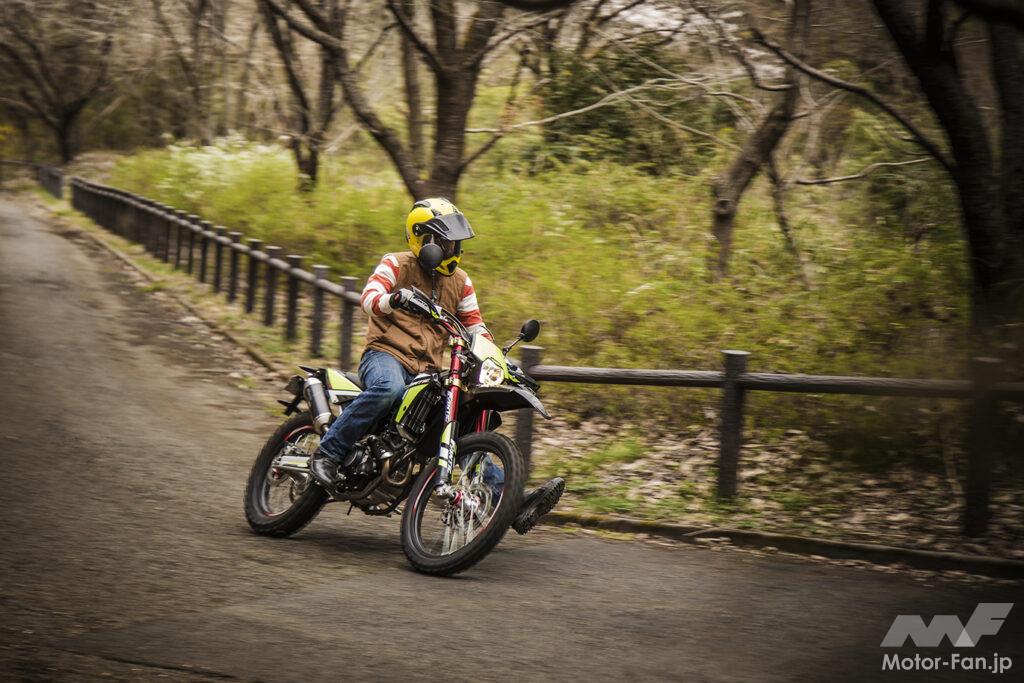 一方でペースを上げると元気な性格も見せてくれる。今年のモデルで新採用されたというミナレリ製エンジンは可変バルブ機能も搭載、高回転域も元気に伸びていってくれるのだ。四輪車が入ってこれないような細い林道において気持ちの良いペースでオフロード走行を楽しむのも良し、そしてそれが行き止まりになった時などには、ローダウンされ足つきが良くなった車体と、簡単にはエンストしないエンジン特性によりUターンもしやすかった。