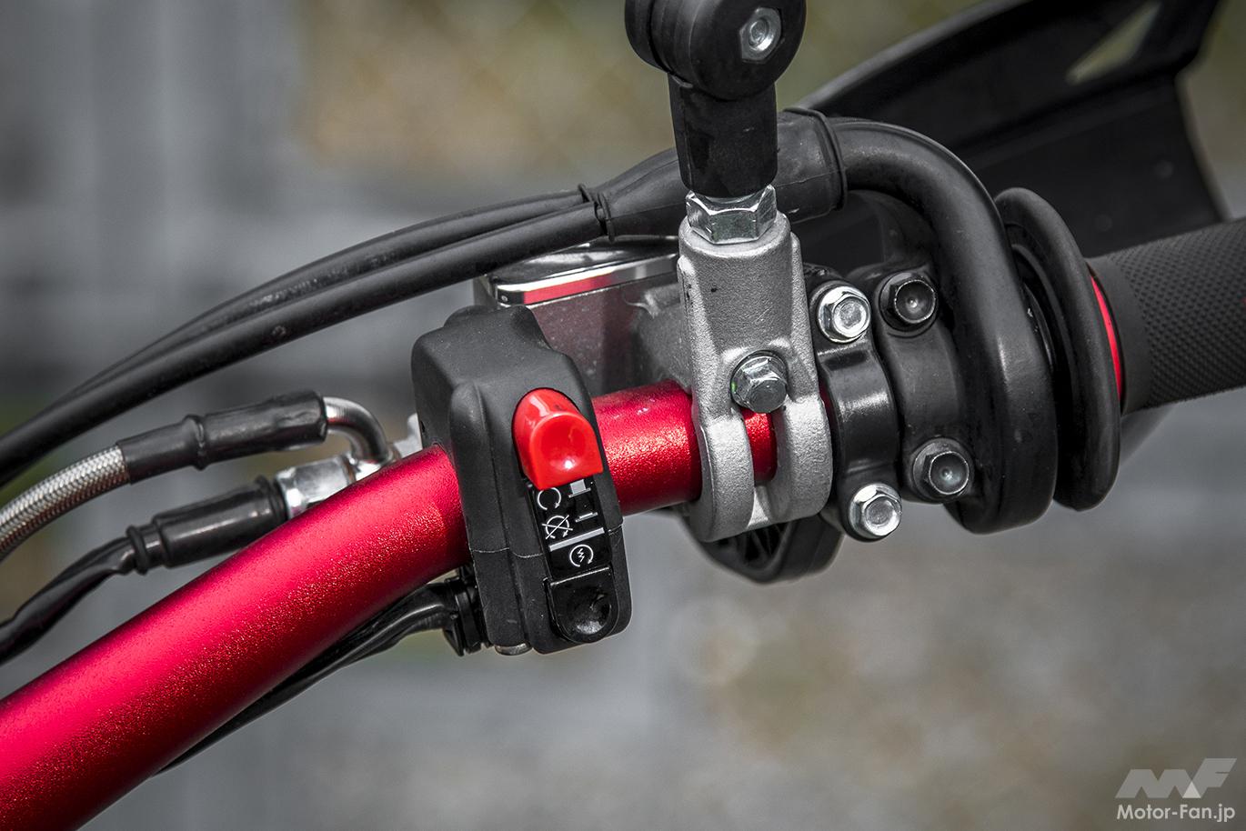 一方でペースを上げると元気な性格も見せてくれる。今年のモデルで新採用されたというミナレリ製エンジンは可変バルブ機能も搭載、高回転域も元気に伸びていってくれるのだ。四輪車が入ってこれないような細い林道において気持ちの良いペースでオフロード走行を楽しむのも良し、そしてそれが行き止まりになった時などには、ローダウンされ足つきが良くなった車体と、簡単にはエンストしないエンジン特性によりUターンもしやすかった。