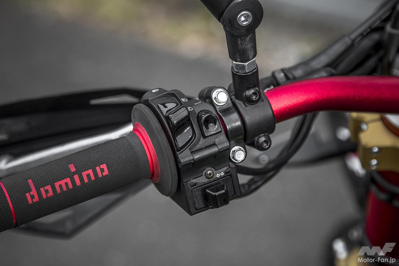 ローダウンされているとはいえ高いシート高、そしてタンク上方へと伸びる薄っぺらいシートなど車体構成からはかなりの「コンペ感」を味わえる。腰に近い位置でハンドルを握るイメージはまるでレーサー、なのだが、同時にそのハンドルは小指側が絶妙に下に向く垂れ角がついているため、いかり肩にならない優しさも持っていた。座っても立ってもコントロールしやすい絶妙な位置と言えるだろう。
