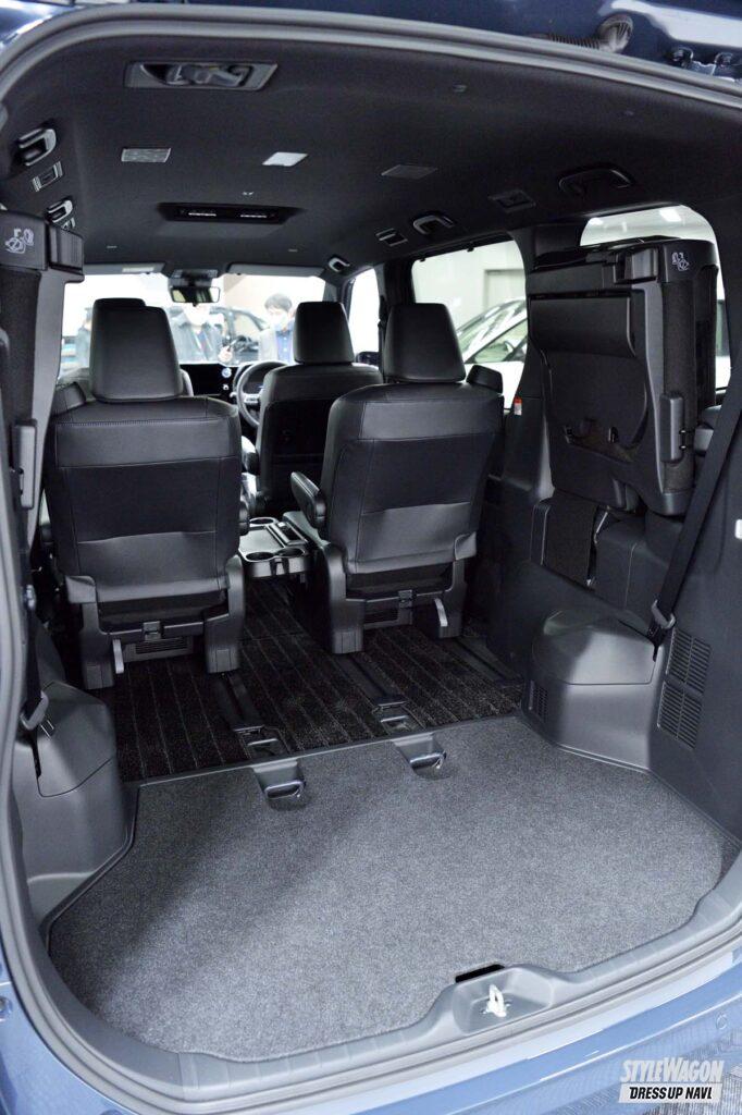 ノア&ヴォクシーは、全車で3列シート仕様となる。2列目が2名掛け(キャプテンシート)では7人乗り、3名掛け(6対4分割ベンチシート)では8人乗りだ。長いホイールベースとフラットフロア化によって2列目・3列目のスペースが確保されているので、頭上・足もとともに広く感じられる。2列目が2人がけの場合、センター部分に通路ができ、ウォークスルーが可能になる。また、3列目への乗降性向上のため、オプションで2列目に2人がけベンチシートを配置もできる。なお、ノア&ヴォクシーどちらも、Z 系グレード(S-Z 、Z )と、およびグレードに関わらずハイブリッド車の4WD 仕様は、すべて7人乗りのみとなる。