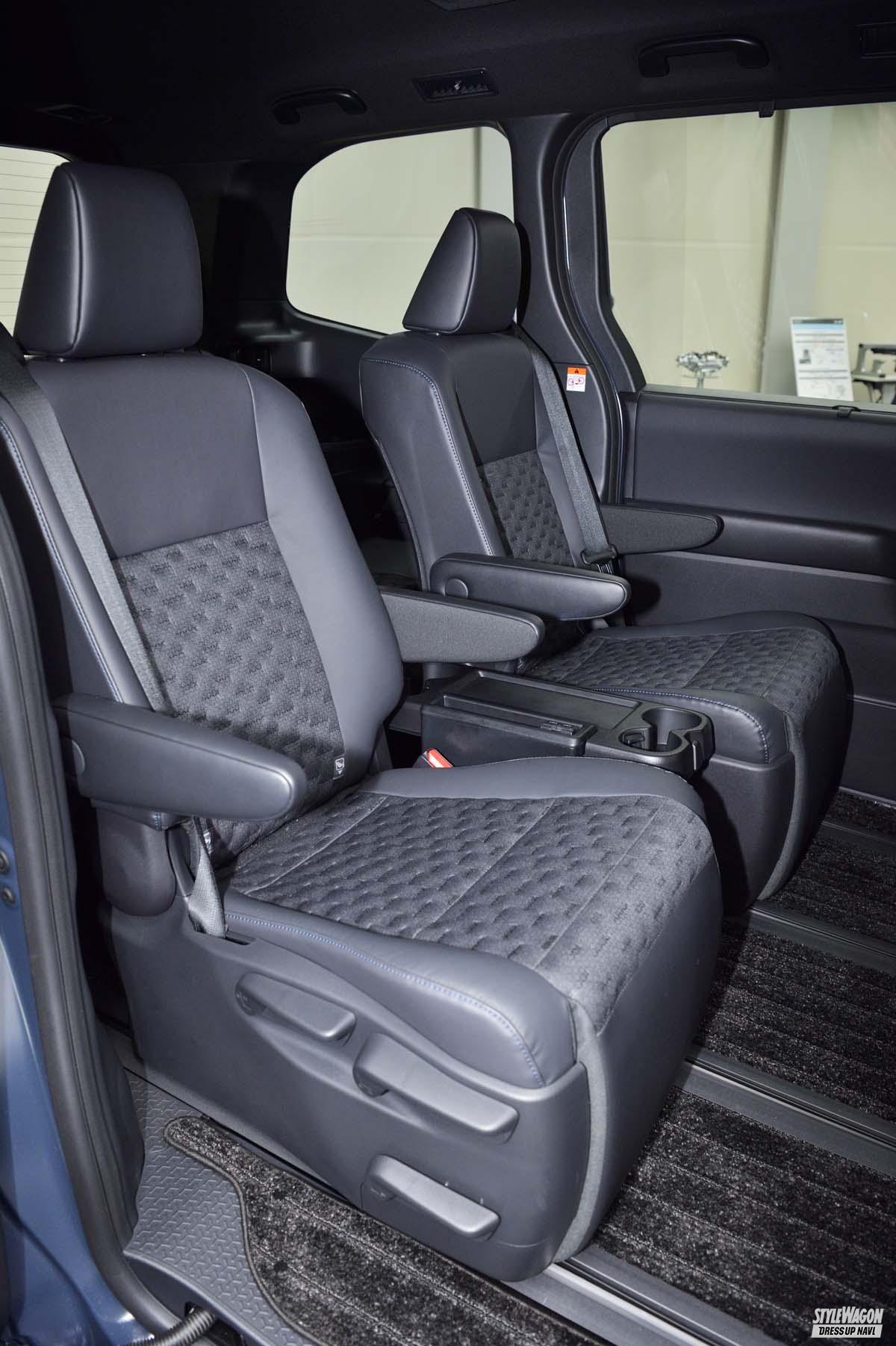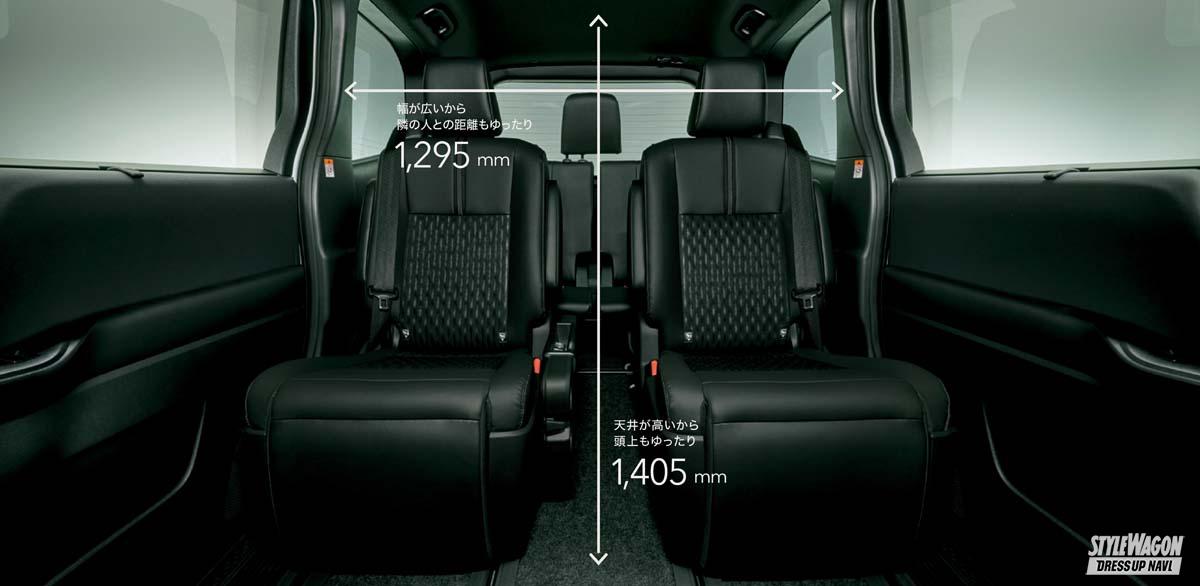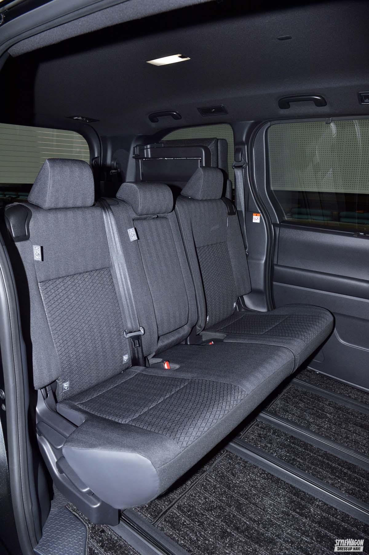 ノア&ヴォクシーは、全車で3列シート仕様となる。2列目が2名掛け(キャプテンシート)では7人乗り、3名掛け(6対4分割ベンチシート)では8人乗りだ。長いホイールベースとフラットフロア化によって2列目・3列目のスペースが確保されているので、頭上・足もとともに広く感じられる。2列目が2人がけの場合、センター部分に通路ができ、ウォークスルーが可能になる。また、3列目への乗降性向上のため、オプションで2列目に2人がけベンチシートを配置もできる。なお、ノア&ヴォクシーどちらも、Z 系グレード(S-Z 、Z )と、およびグレードに関わらずハイブリッド車の4WD 仕様は、すべて7人乗りのみとなる。