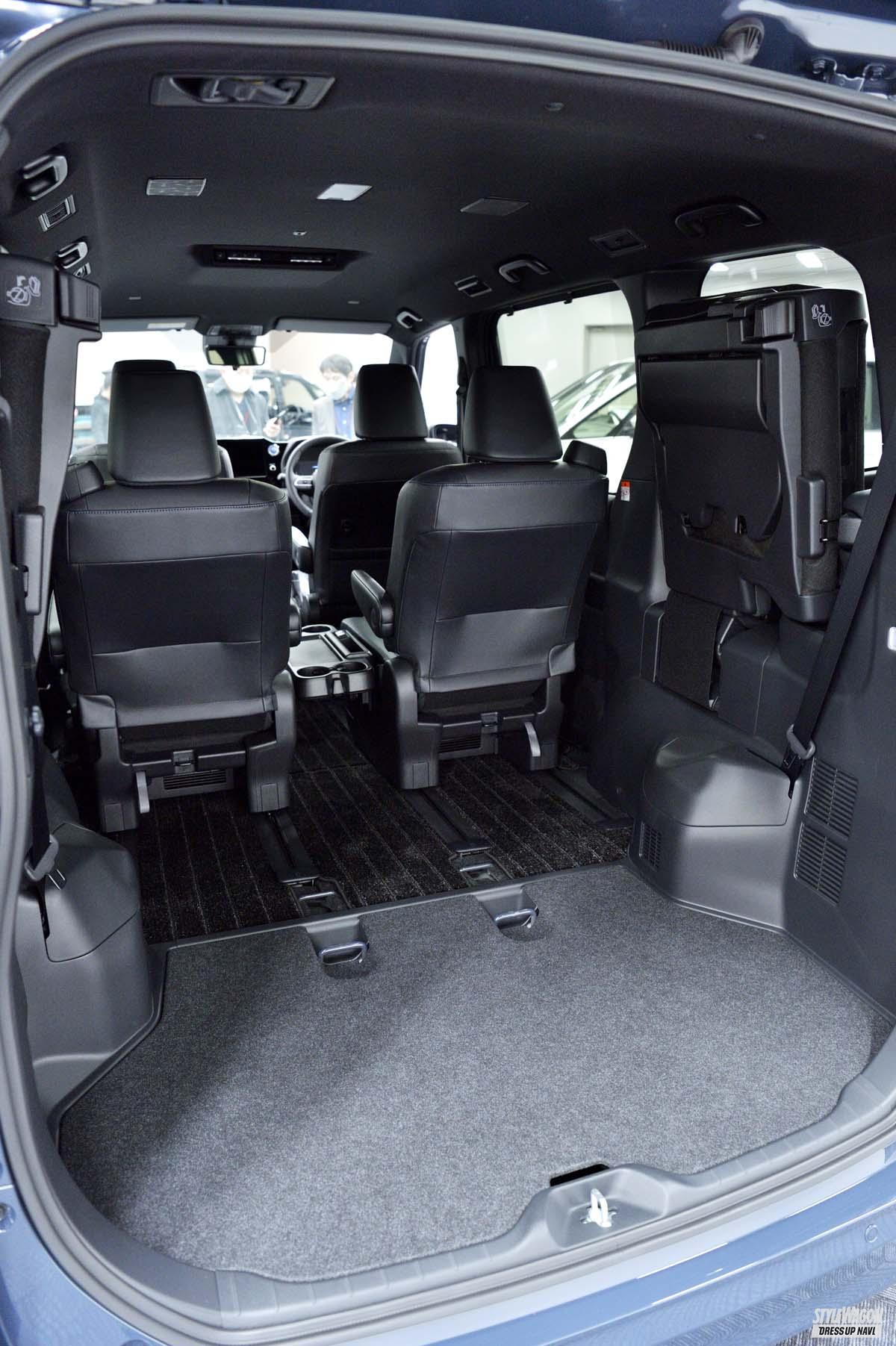 車体設計の際に、燃料タンクやバッテリー(ハイブリッド車)、リアモーター(E -Four 車)のレイアウトを根本から見直すことで、広くフラットなフロアを確保。3列シート車では定員乗車時のラゲッジ容量が小さくなりがちだが、新型ノア&ヴォクシーでは、床下にスーパーラゲッジボックスを配置することなどにより、大容量のラゲッジスペースを実現している。