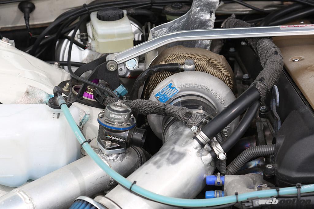 タービンは1.5JZと組み合わせるには少し小さめというTD06SH-25G(10cm2)。ただし低速トルクが出る方向なので、ドリフトを楽しむにはちょうど良いくらいとか。サーキットで酷使しているもののノントラブルだ。