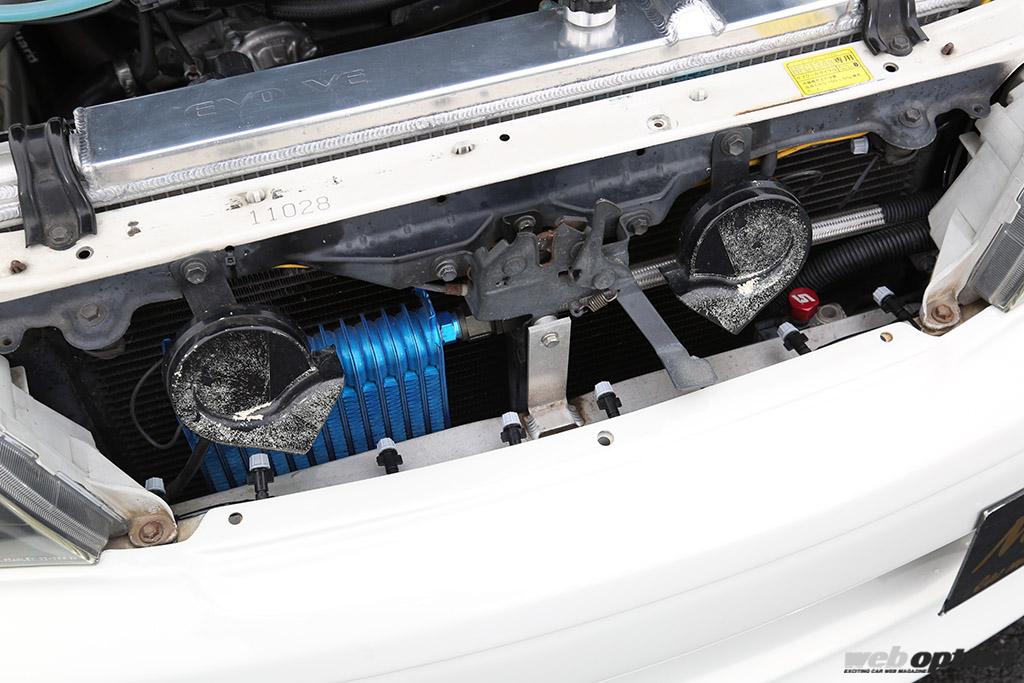 ラジエターやオイルクーラーの前に設けられたウォータースプレーは、スバル用のヘッドライトウォッシャーノズルを流用。噴射パワーがあり、冷却効率は抜群。オーバーヒート気味になっても、水を噴射することで一気に温度が下げられるので重宝するとか。ワンオフものだが、製作の相談も大歓迎とのことだ。