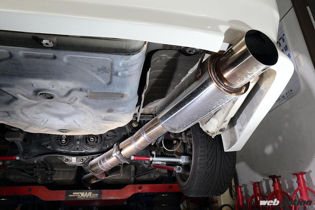 リヤのワイドフェンダーはスムージング処理をして美しく仕上げる。足回りは、サスペンションプラスの低反発サスを組み合わせたオリジナル車高調を軸に構築。フロント22kg/mm、リヤ20kg/mmというハイレート仕様だが、しなやかに路面を追従する特性だ。