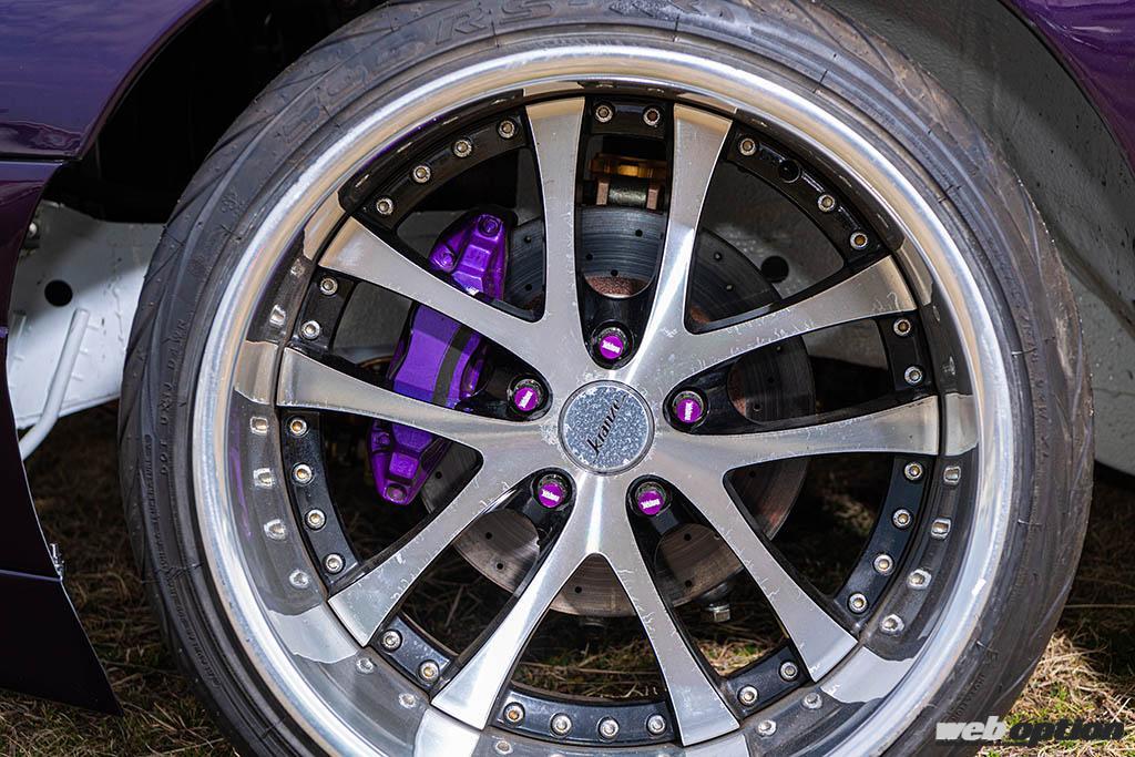 ホイールは前後ともに18インチのウェッズクレンツェLXZで、リバレル化によってフロントが11Jマイナス53、リヤが13Jマイナス53という驚異的なワイドさとディープリムを誇る。ブレーキキャリパーは前後ともにR33タイプM用を流用。リヤは油圧サイドブレーキの投入に合わせてツインキャリパー仕様だ。