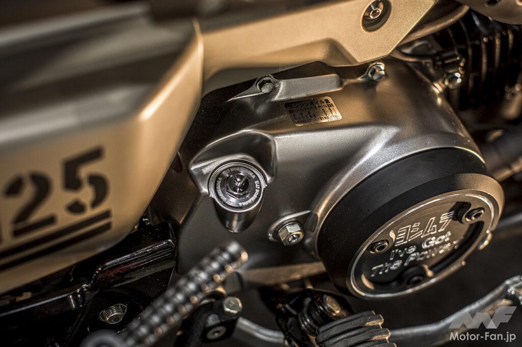 シリンダーヘッドにはアルミヘッドサイドカバー、クラッチカバーにはアルミエンジンケースガードKITクランクケースカバー「PRO SHIELD」とオイルフィラーキャップ Type-FB(M20xP2.5mm)を組み合わせ、エンジン周りの見た目をグレードアップしている。