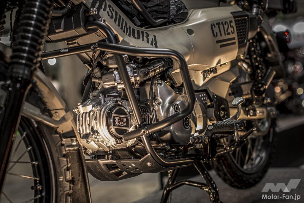 ヨシムラのマフラーは、走りを意識したモデルが多数を占めるのが特徴。一方、現在開発中である写真のマフラー「タクティカル・サイクロン(仮称/参考出品)」は、CT125ハンターカブが持つアウトドア系の外観にトコトンこだわったデザインが特徴。