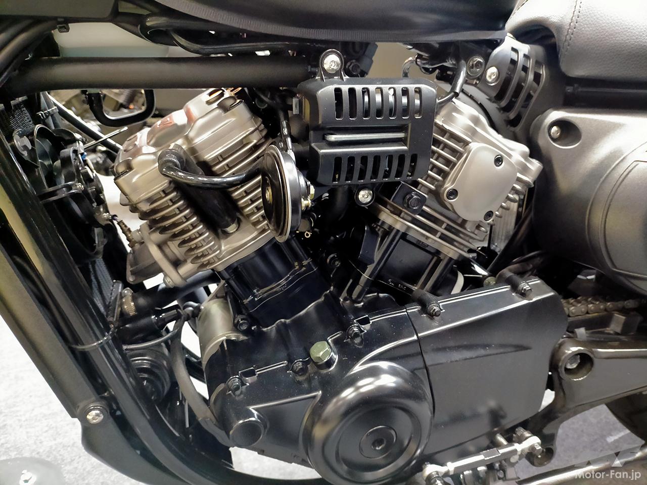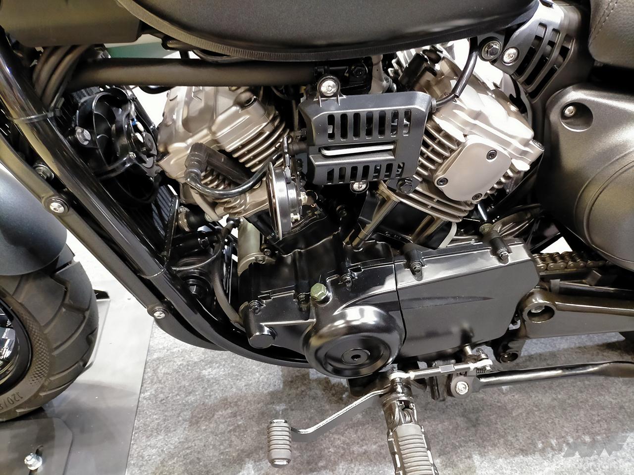 日本導入モデルは、新排ガス規制のユーロ5に適合。GV300S BOBBER最大のポイントは、水冷式ながら空冷式のような冷却フィンを設け、ダークシルバーに塗装された、芸術的ともいえる美しいVツインエンジン。