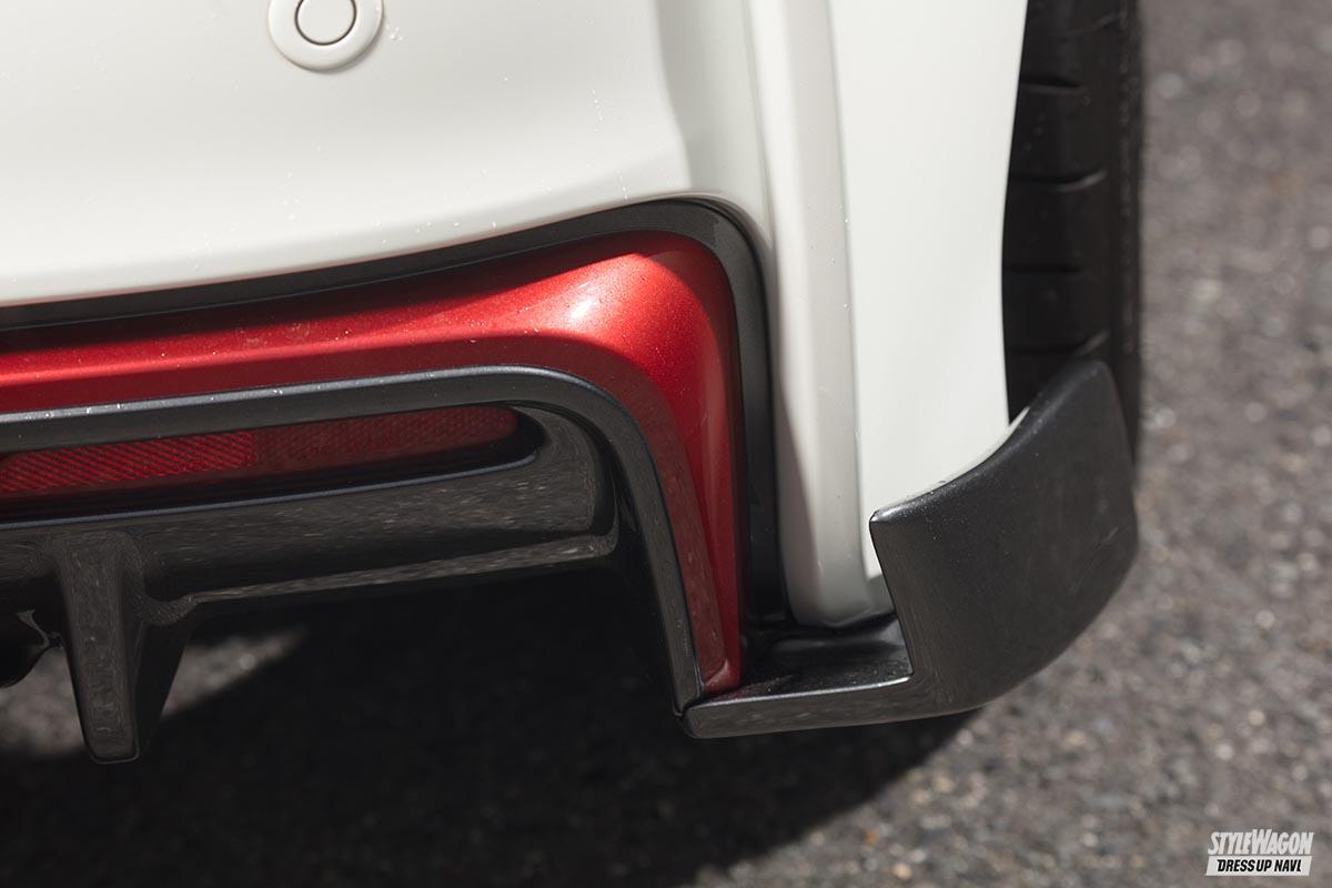 デザイン的には「完成されているニスモのラインを崩さないように、少しだけスポーティさをプラスした」もの。エアロはすべてニスモのエアロラインにジャストフィットしているため、後付け感なくニスモ+αの魅力的なスポーティフォルムが楽しめる仕上がりとなっている。