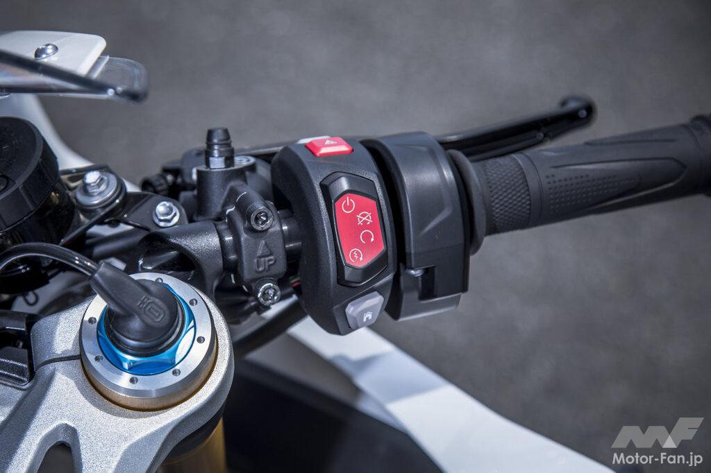 ドイツ産ピレリ製SUPERCORSA SPを履く。フェンダーはカーボン製。フロントフォークはφ43mm倒立式フルアジャスタブルのオーリンズ製。ラジアルマウントされたブレンボ製油圧キャリパーは対向4ピストンのモノブロック式。ローターサイズはφ320mm。