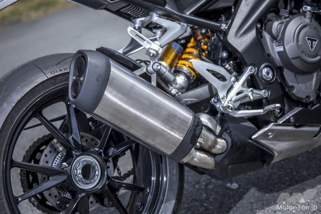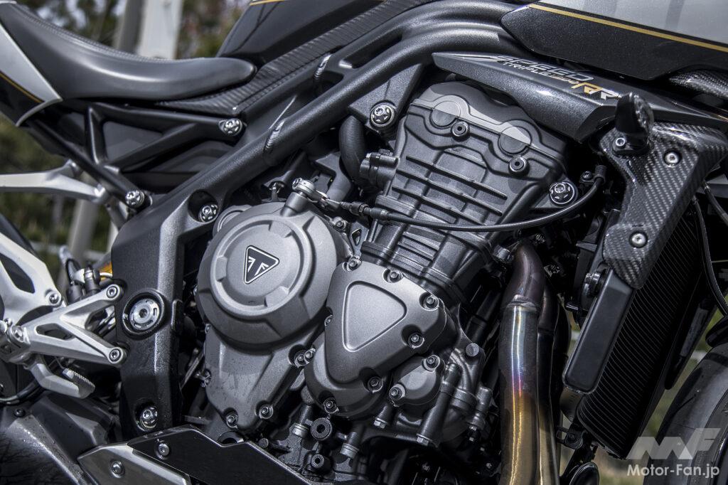 ツインスパーフレームはアルミニウム製。マスの軽いクランクがマッチされた水冷直(並)列3気筒エンジンを搭載。高圧縮比を稼いだシリンダーヘッドにはDOHC12バルブが収められている。