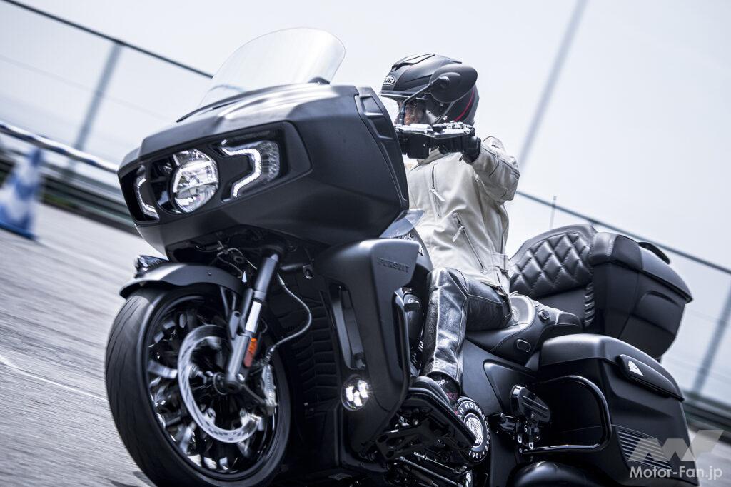 当たり前のことだが、加速も減速も旋回も、車体の挙動は緩慢。鋭い身のこなしは期待すべくもないが、逆にゆったりと常に落ち着きはらった安定感の高い乗り味が、ロングクルーザーとしてとても魅力的に思えた。誤解無きよう付け加えておきたいのは、動力性能も旋回性能も、そして減速性能も意外と思えるほど高いレベルにあり、なおかつ軽快と言える確かな扱いやすさがある。