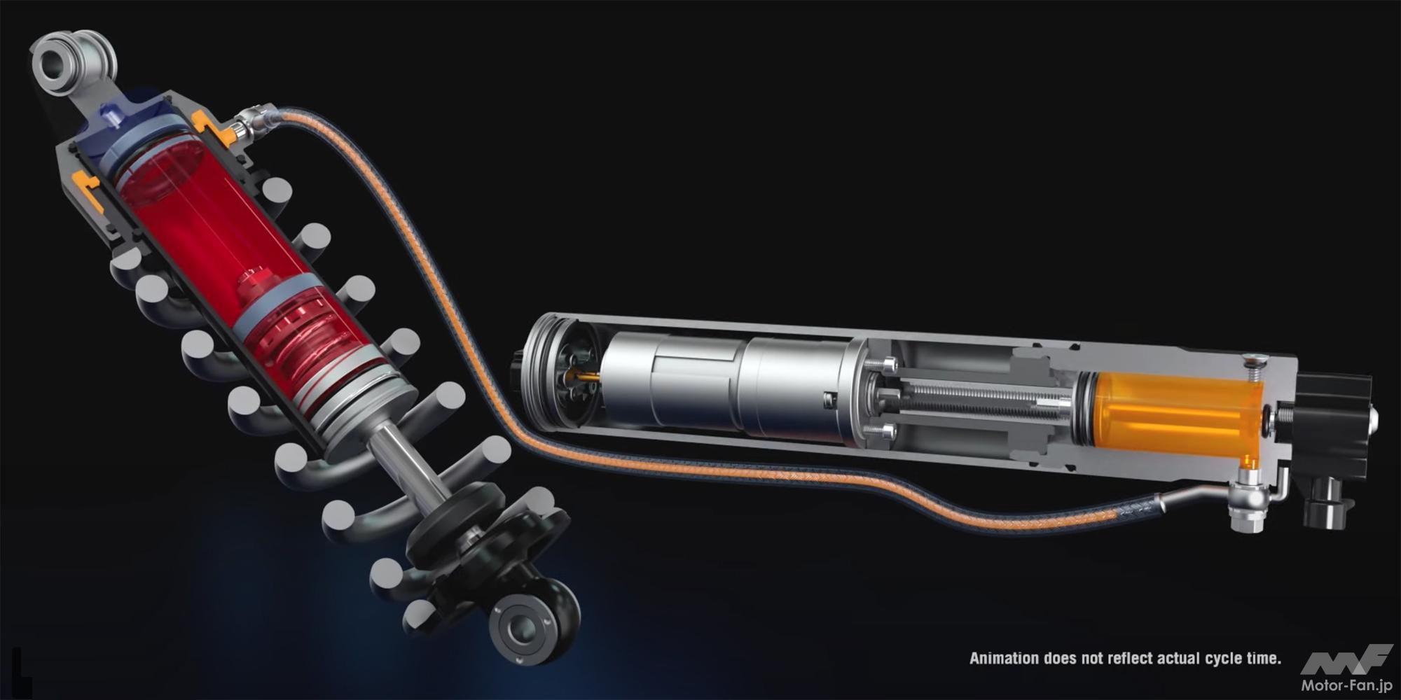 スプリングのアッパー部には油圧機構が装備され、後輪左脇に水平搭載された油圧ポンプを電動で作動させる事でスプリングが圧縮されてプリロードが可変できる仕組み。もちろんそれら一連の動きは電子制御される。