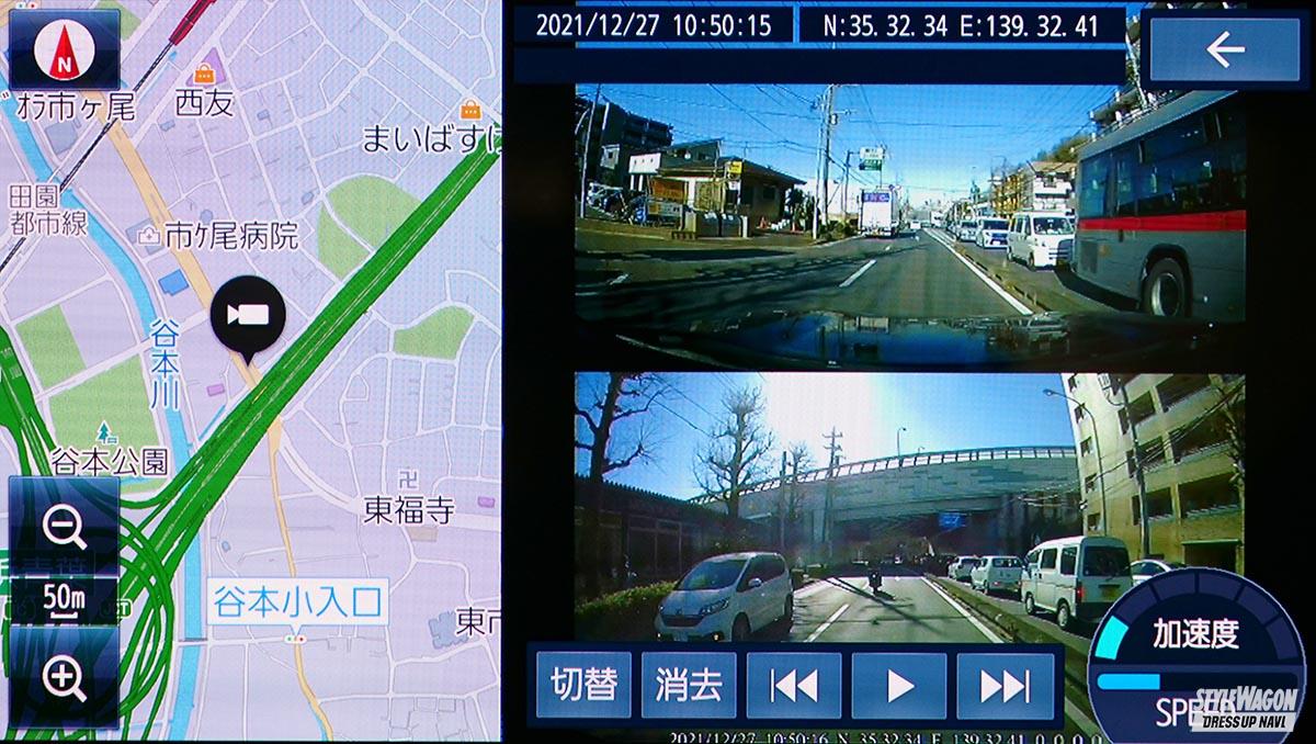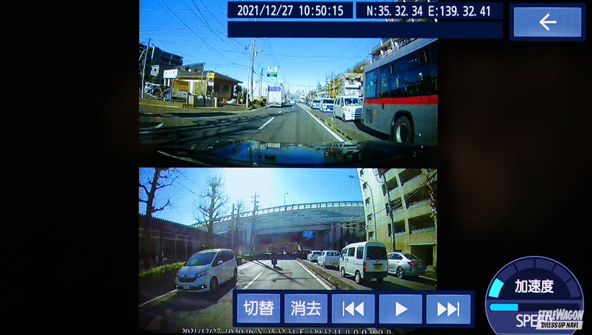 ストラーダとの連携機能が充実し、記録映像はHD画質の高解像度で再生。各種の設定操作はタッチパネルで行える。また、駐車中に振動を検知して作動する「駐車録画モード」や、地図上のアイコンにタッチすると車両後方の映像を表示する「ワンタッチ後方ビュー」、シフトレバーをリバースに入れると車両後方のガイドライン入り映像を表示する「リバース後方ビュー」などの機能も備えている。