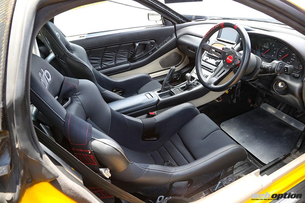 「自走でサーキットへ行き、タイムアタックをして自走で帰ってくる」ことがコンセプトのため、ナビやオーディオなどの快適装備は残したまま。先代が15年をかけて完成させたマシンだが、大切に乗られていることが強く印象付けられる室内だ。追加メーター類は装備しておらず、車両情報はデフィのスポーツディスプレイFにて一元管理を行なう。