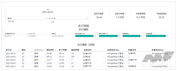 急ブレーキをかけた地点を表示することで危険な場所の把握やドライバー毎に最適な安全運転を指導してくれる。