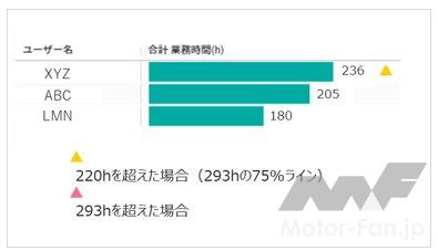 多忙な業務に追われる時でも、簡単にドライバーの業務拘束時間の累計を把握して、働き方改革の推進をサポートする。特に、労働基準法の年間残業時間規制が2024年から導入されるにあたり、月293時間の上限に対して一目で拘束時間累計を把握できるようになることで、業務管理の効率化が可能となる。