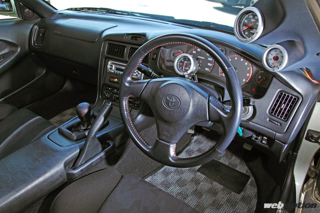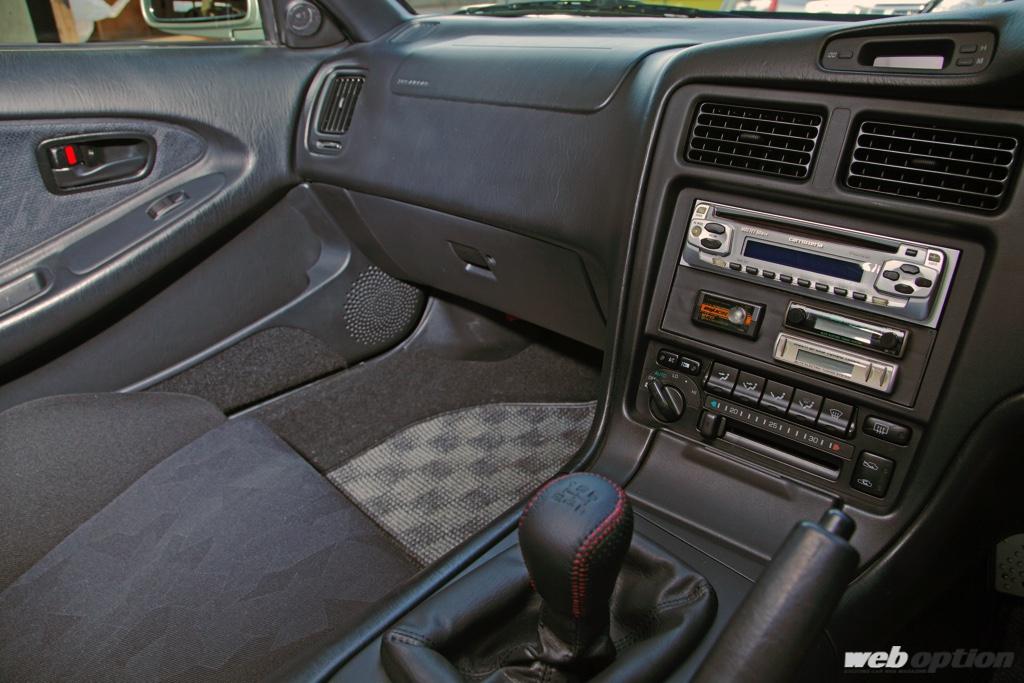 樹脂パーツ類に一切の劣化が見られないインテリアは、新車レベルの極上コンディションだ。Aピラーとコラム上にはアペックスELメーターが配備され、センターの1DINスペースにはビリオンVFC、HKS EVC、ブリッツターボタイマーが並ぶ。どれも90年代にブレイクしたパーツだ。