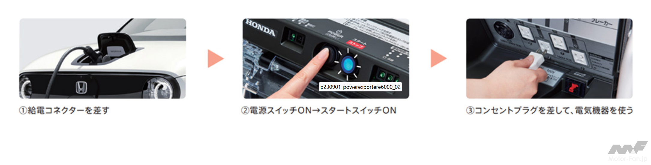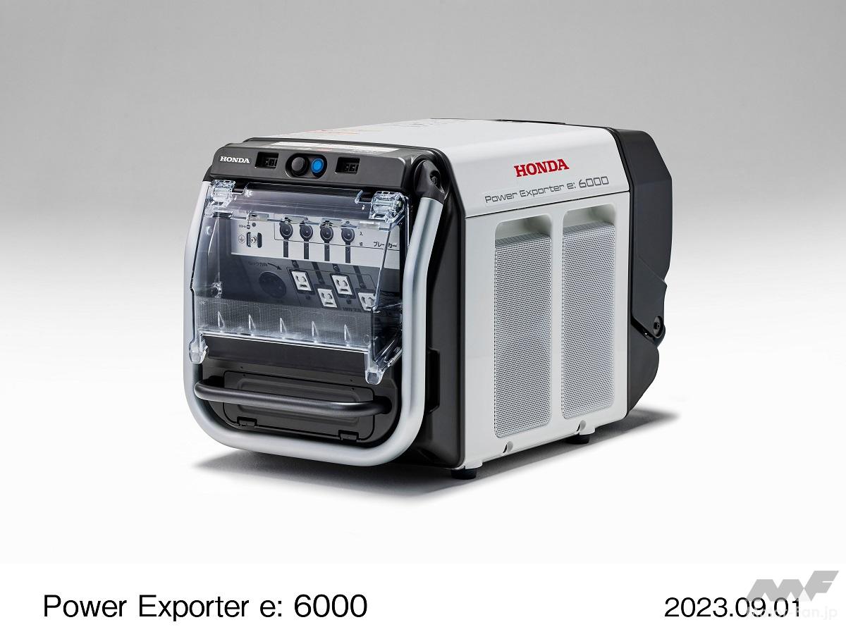 Power Exporter e: 6000は、Hondaがポータブル発電機の開発で培った、独創の正弦波インバーター技術を採用。精密機器や楽器など、電気の質が求められる製品にも対応する高品質な電力の供給が可能な可搬型外部給電器だ。電動車両と接続することで最大6kVA※2の電力を出力でき、平時はイベントやコンサート、レジャーなどにおける電源として、有事の際には避難所や小規模オフィス、店舗の非常用電源としてなど、多様なシーンでの活用が期待されている。
