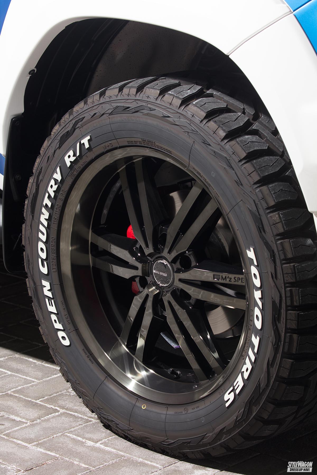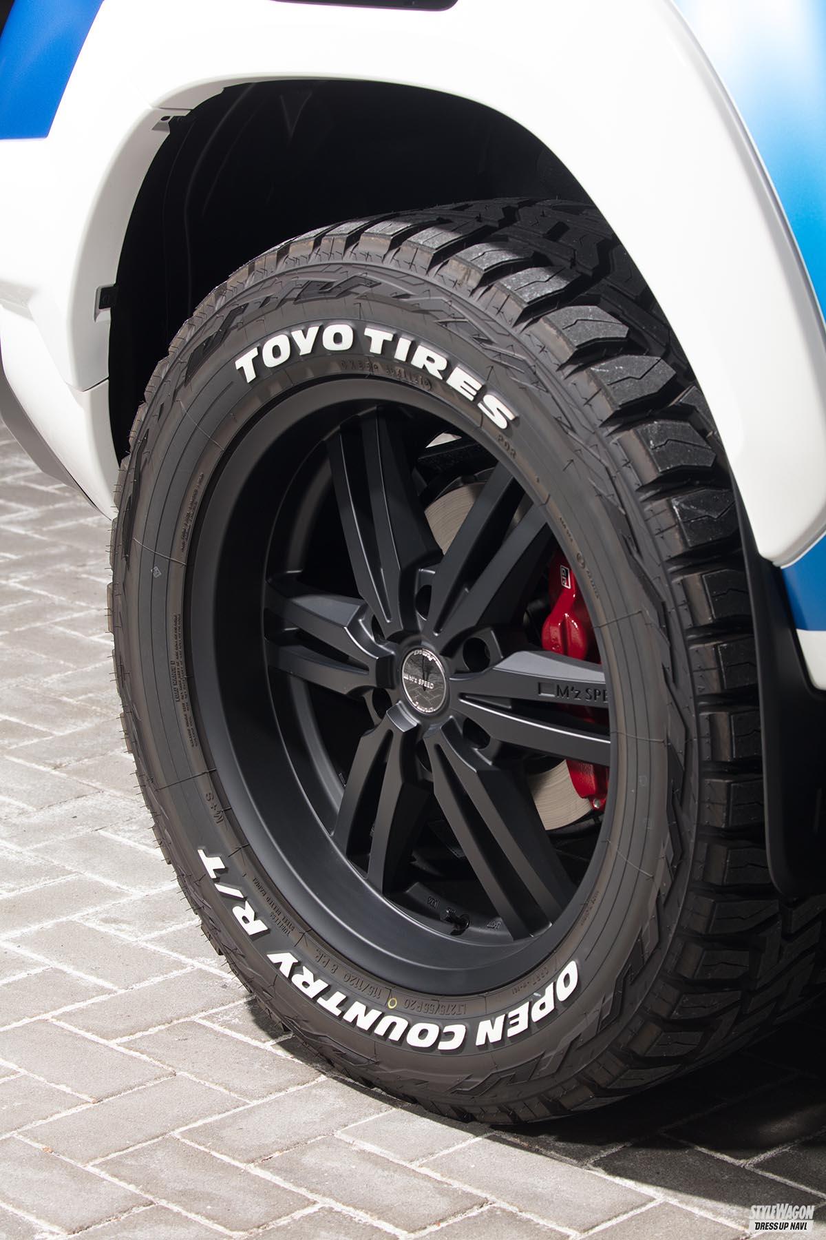 ダミナミックなオリジナルホイールは、デモカー装着の20×8.5のワンサイズ。ご覧の2色のほかにブラポリもあり。装着の275タイヤはかなり太いため、フロントインナーが干渉するとのこと。