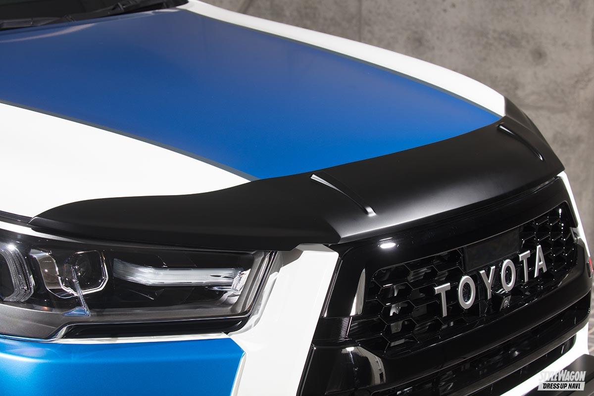 オリジナルのカスタムラッピングを駆使した、爽快系ハイラックスを手掛けたのはエクスクルーシブゼウス。GRスポーツを選んだ理由は「専用バンパーやグリル、なによりオバフェンが付くフォルムがカスタム向きなため」と広報担当。持ち前のアクティブさを活かしたまま、違いを楽しめるパーツを各種用意した。
