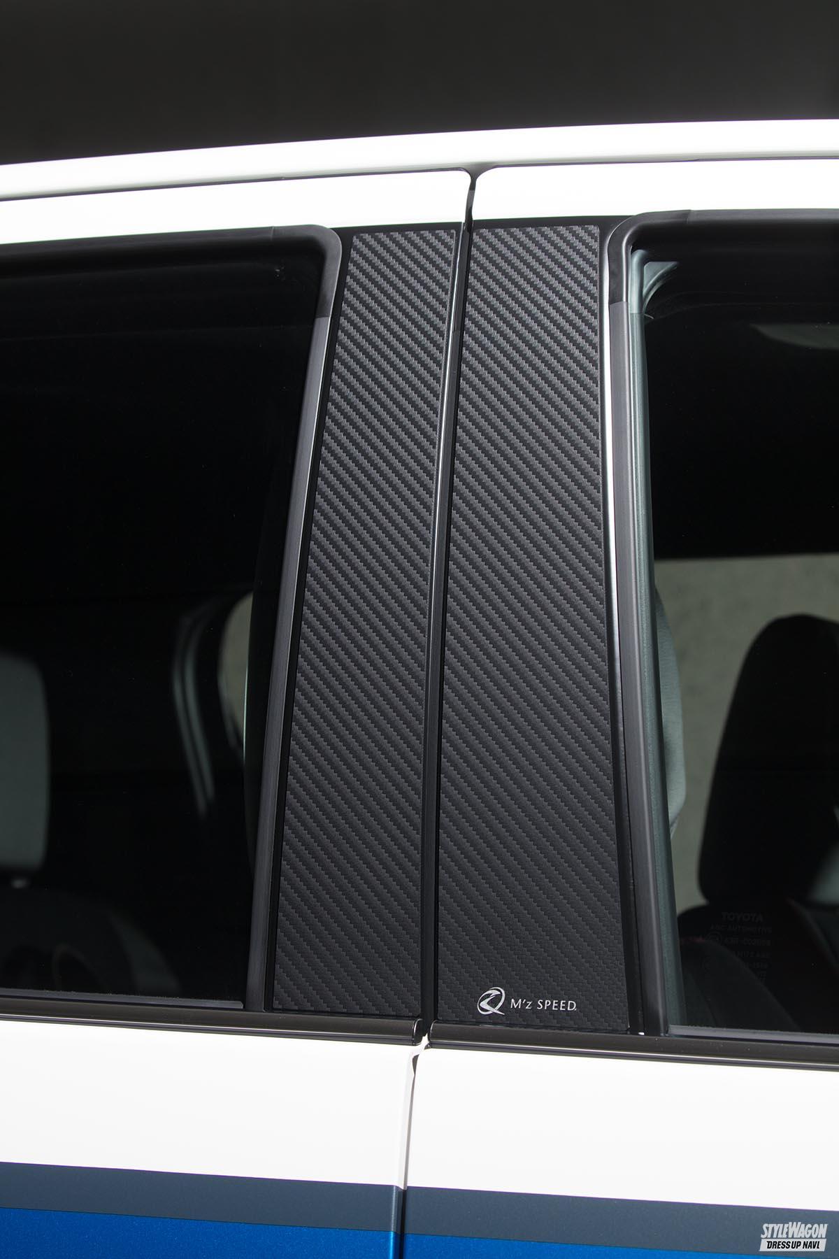 味気ない側面部をスポーティなカーボン調でデコるピラーパネルも、エアロと同じAES樹脂製だ。販売は4Pセット。