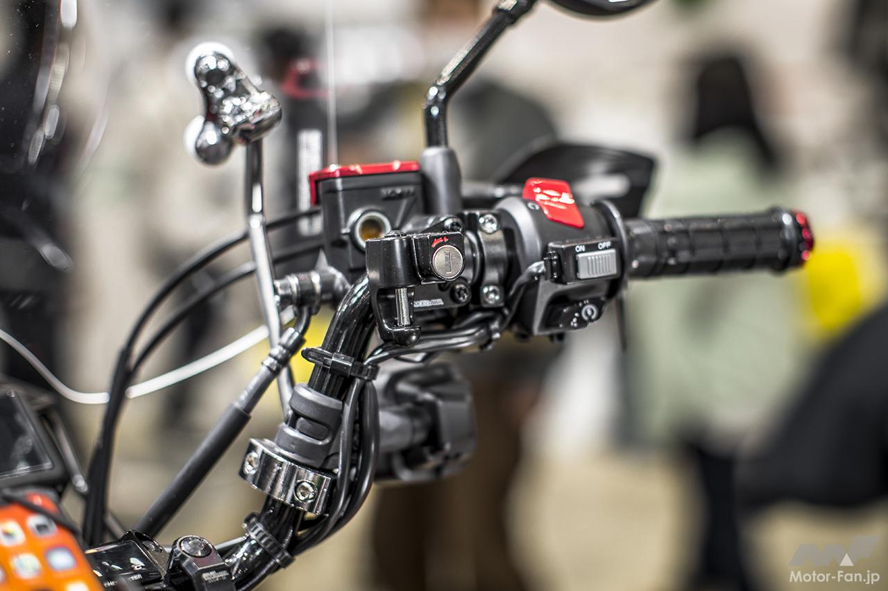 足元にバッグ等を固定することができるセンターキャリアキット、減衰力とバネレートを見直すことで路面への追従性を高め、安定した走行を実現したオイルダンパー式リアショックアブソーバー、レッグシールドに取り付けられたLEDフォグランプキットなど、細部まで丹念にカスタムされている。