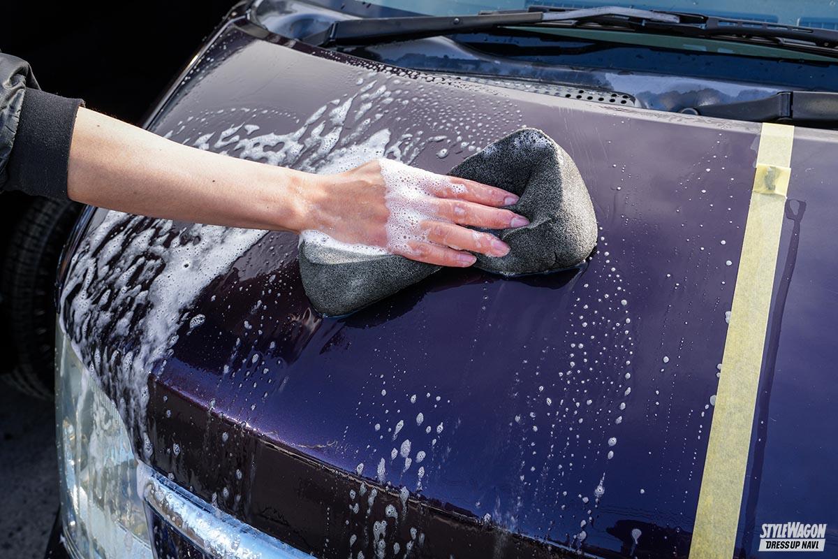 うすめたベースコートで洗車スポンジを使い洗い上げる。洗剤が乾く前にしっかりと水で洗い流す。