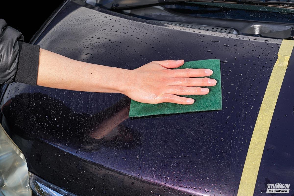水滴が残った状態のボディに、速やかにトップコートを含ませたスポンジでなでるように拭き上げる。