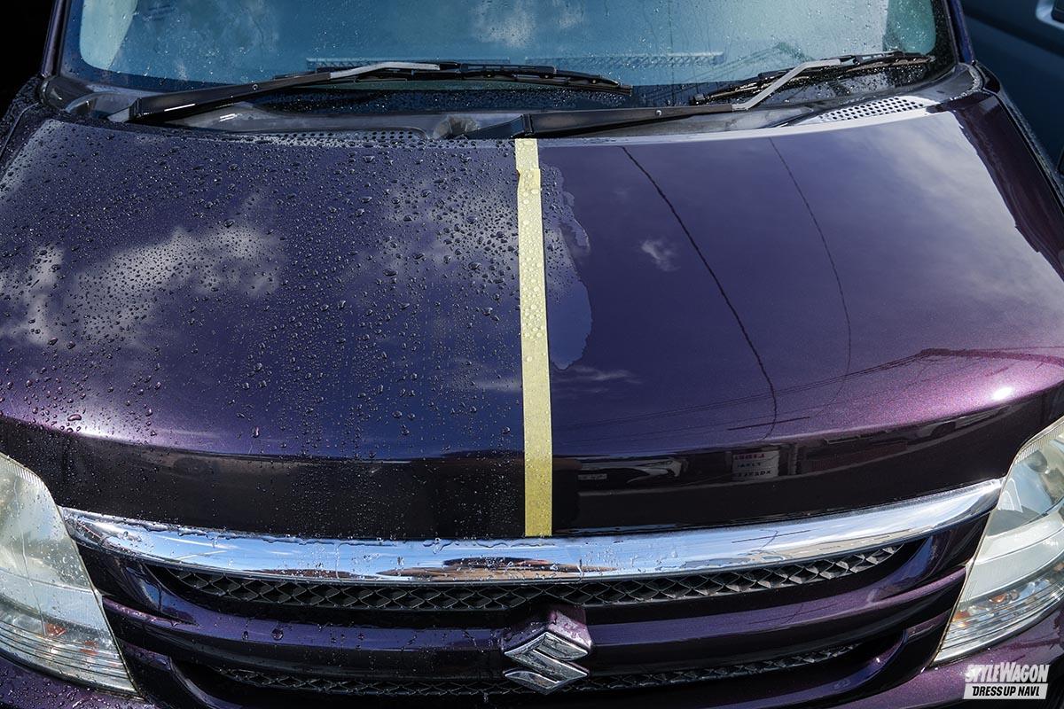 ダブルウォッシュコーティングの効果を比較する為にボンネットの半分だけを施工。写真右側の未施工状態に水を掛けてみると、水捌けが悪くべた〜っとした状態。対して左側の施工後は、水滴が流れ落ちて艶感も実感できた。