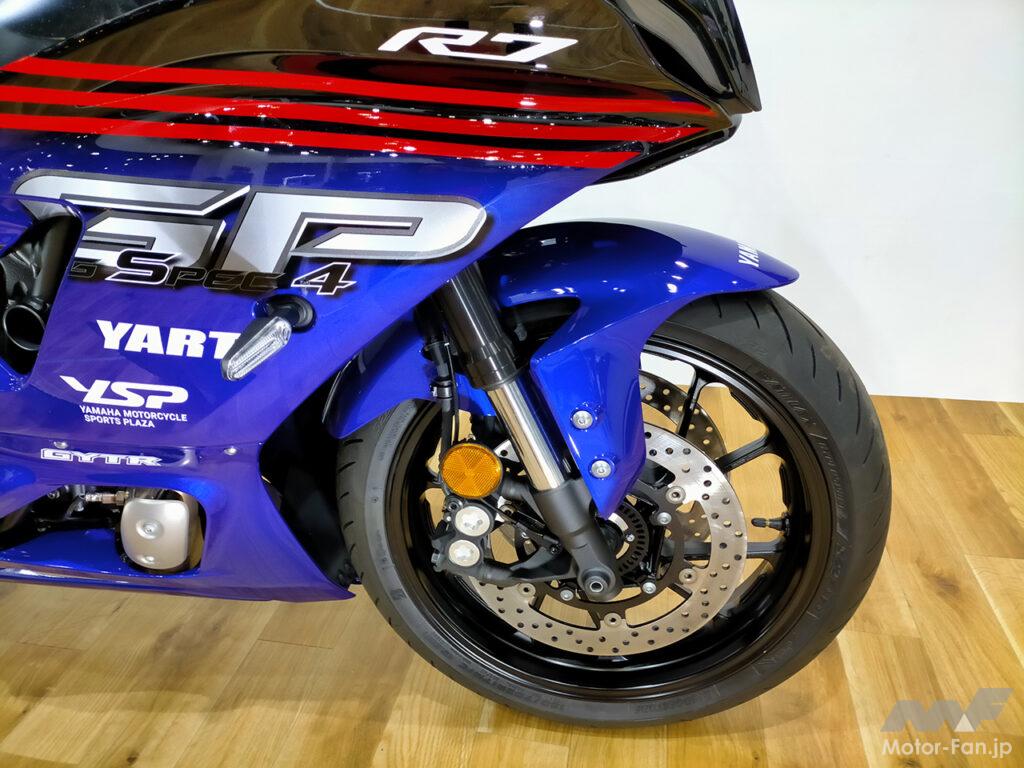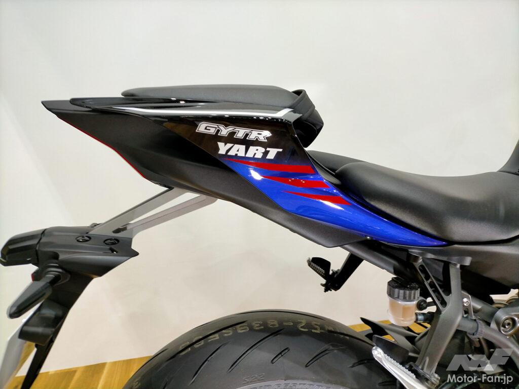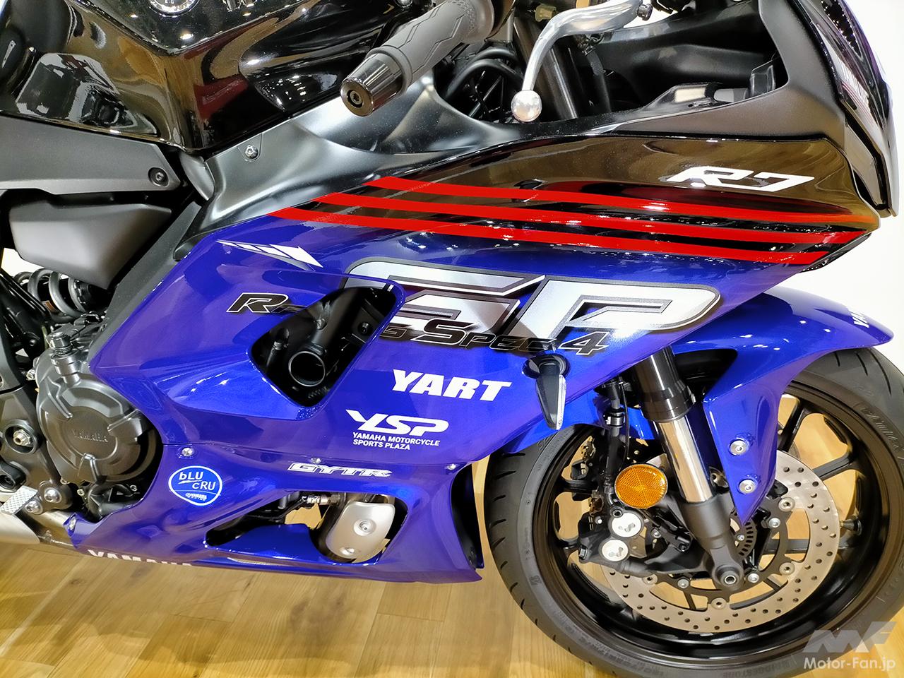 写真はレース車両のカラーリングを彷彿とさせる、ブラック/ブルーのグラデーションが特徴的な外装セット「YZF-R7 YAMALUBE 外装セット」装着車。2020年に鈴鹿8時間耐久ロードレースで「YART Yamaha Official EWC Team」が走行予定だったマシンカラーリングをモチーフにしているのがポイントだ。