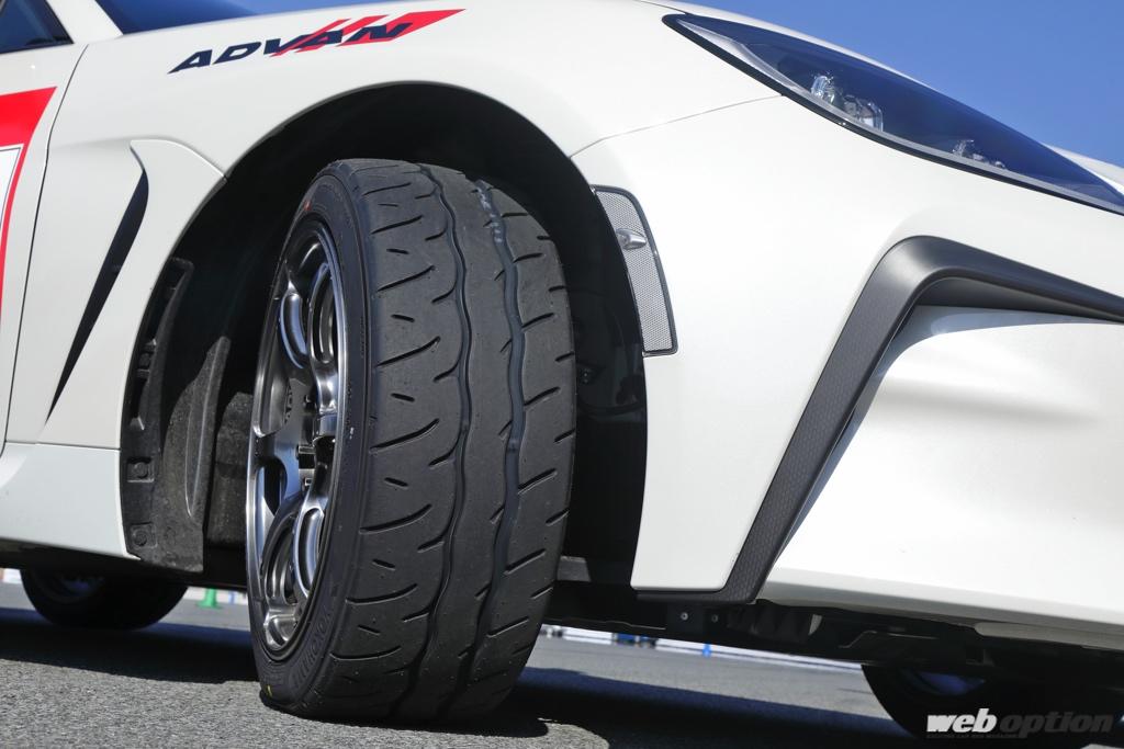 アドバンサーキットエクスペリエンスでは、メインのサーキット走行以外にも盛り沢山のお楽しみコンテンツが用意されていたのもポイント。その一つが、新型アドバンネオバAD09のモニター試乗会。特設パイロンコースに用意された2台のGR86で、なんとアドバンネオバAD09とポテンザRE-71RSの乗り比べが出来たのだ。