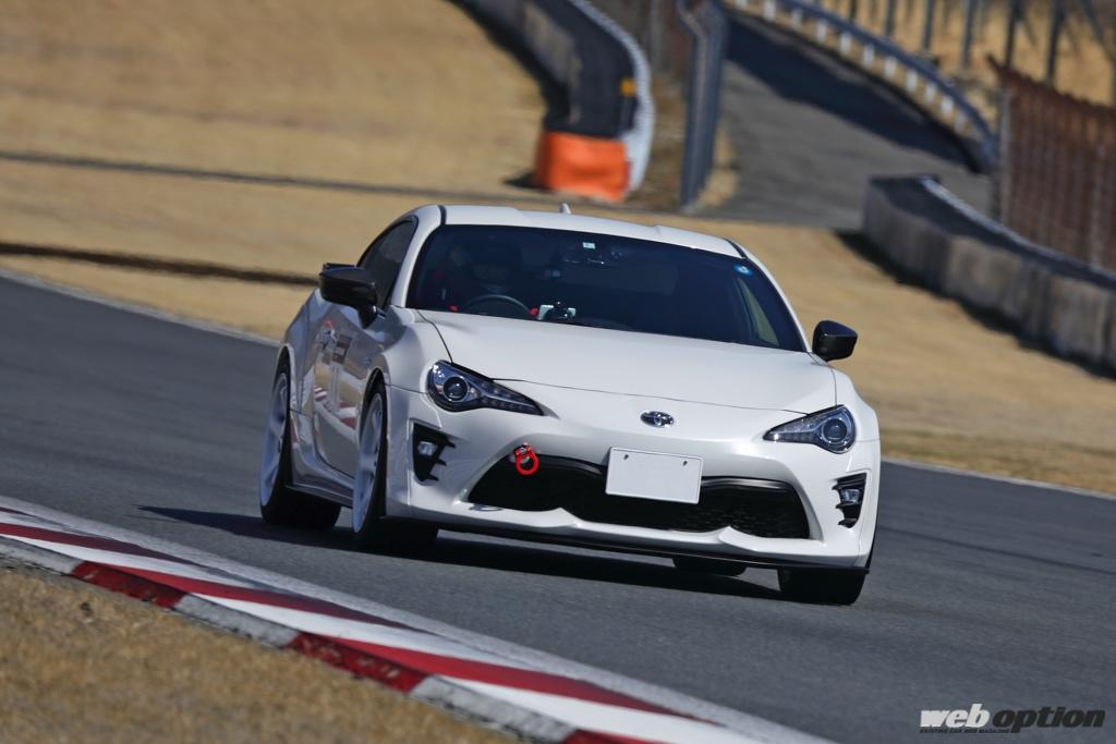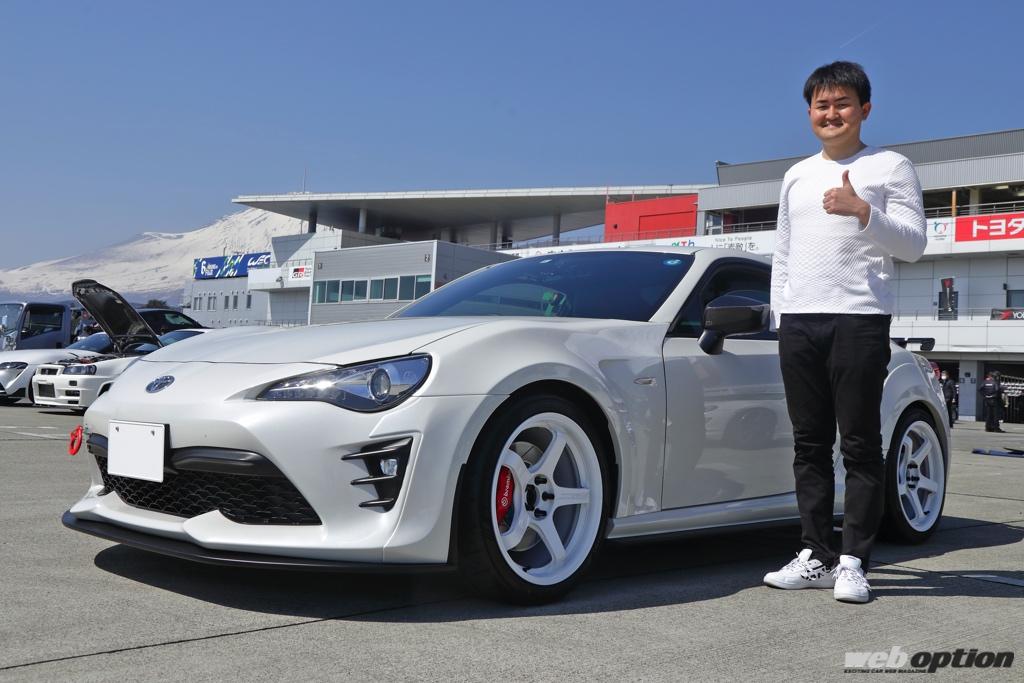 ZN6型の86後期で参加していたのは、サーキットは今回が2回目という“しげちー”さん。愛機は130Rヨコハマでカスタマイズしたもので、憧れの織戸選手のマシンのフルレプリカといえる内容。この走行会に合わせて、タイヤもAD08RからAD09に履き替えてきた。