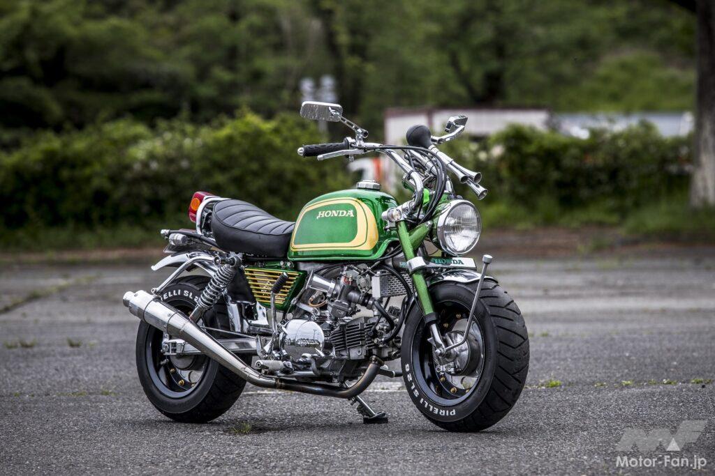 ノーマルでも逞しいスタイルのゴリラだが、こちらのカスタム車はどことなく可愛らしく感じないだろうか。可愛く見える秘訣はメタリックグリーンに塗装され、ゴールドのストライプで彩られた外装にもあるが、それ以上に効果的なのが全長だ。実にフレームを10cmほど延長して安定感をもたらし、さらに純正比16cm長となるスイングアームを組み合わせて合計26cmも長くされているのだ。オーナーの諸川大和さんは「可愛くレトロな仕上げ」を目指したそうで、長さを強調することでバイクらしさを追求しつつゴリラのサイズ感を失うことないカスタムとしているのだ。長くなったスタイルにはさらに秘密がある。延長したフレーム先端のネック部分を寝かせているのだ。これにより立ち気味な純正のスタイルから大きく印象を変えることに成功している。