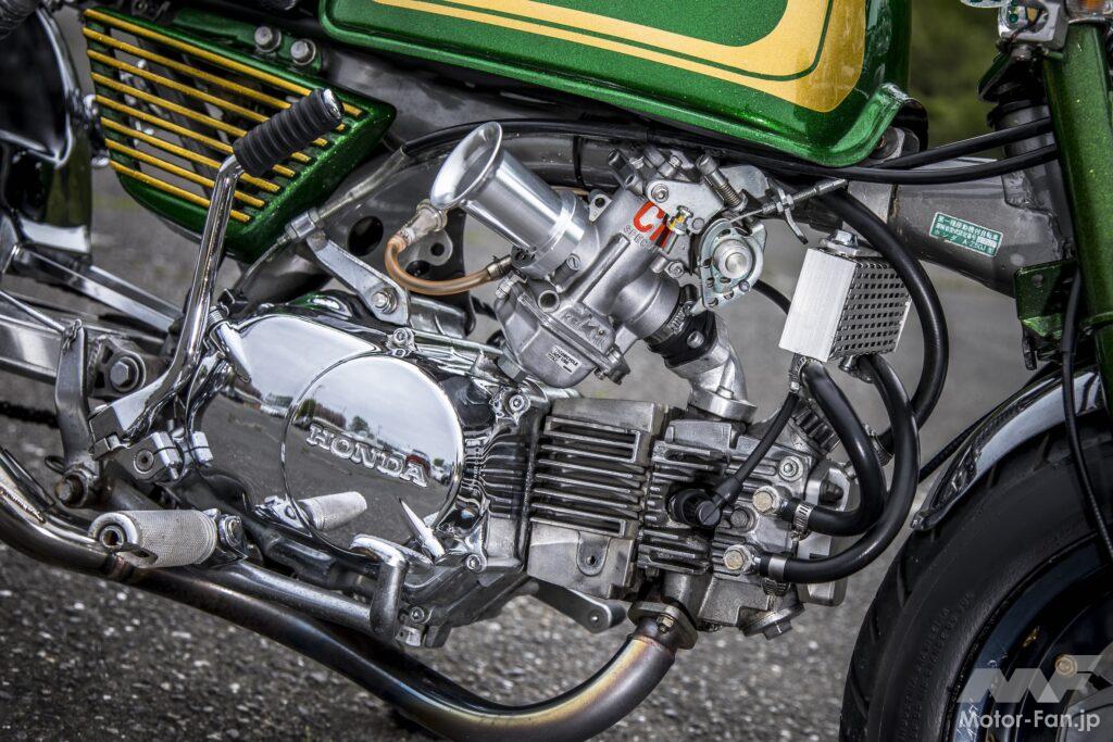 可愛らしさと迫力を備えたスタイルらしく、もちろんエンジンもチューニングしてある。CD90のエンジンをベースにSP武川のシリンダーとピストンを使って111ccにまでボアアップしてある。さらに吸気はケーヒンCR26キャブとされ、マフラーは抜けの良いファルコン製。排気量アップだけでなく吸排気系を見直すことでスロットルレスポンスやピークパワーの向上も実現してある。長くなった分だけ重くなる車両重量だが、倍以上への排気量アップだから重量増を補ってあまりある動力性能となっているのだ。これらのカスタム&チューニングを自ら行えるところも4MINIの魅力。まさにプラモデル感覚で外装から動力性能まで思いのままにカスタムできる。改めてモンキー・ゴリラの楽しみ方を教えてくれた。