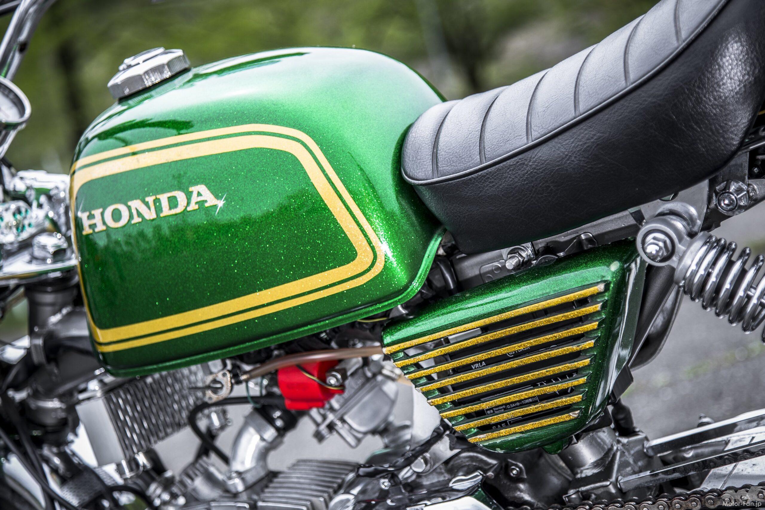 ノーマルでも逞しいスタイルのゴリラだが、こちらのカスタム車はどことなく可愛らしく感じないだろうか。可愛く見える秘訣はメタリックグリーンに塗装され、ゴールドのストライプで彩られた外装にもあるが、それ以上に効果的なのが全長だ。実にフレームを10cmほど延長して安定感をもたらし、さらに純正比16cm長となるスイングアームを組み合わせて合計26cmも長くされているのだ。オーナーの諸川大和さんは「可愛くレトロな仕上げ」を目指したそうで、長さを強調することでバイクらしさを追求しつつゴリラのサイズ感を失うことないカスタムとしているのだ。長くなったスタイルにはさらに秘密がある。延長したフレーム先端のネック部分を寝かせているのだ。これにより立ち気味な純正のスタイルから大きく印象を変えることに成功している。