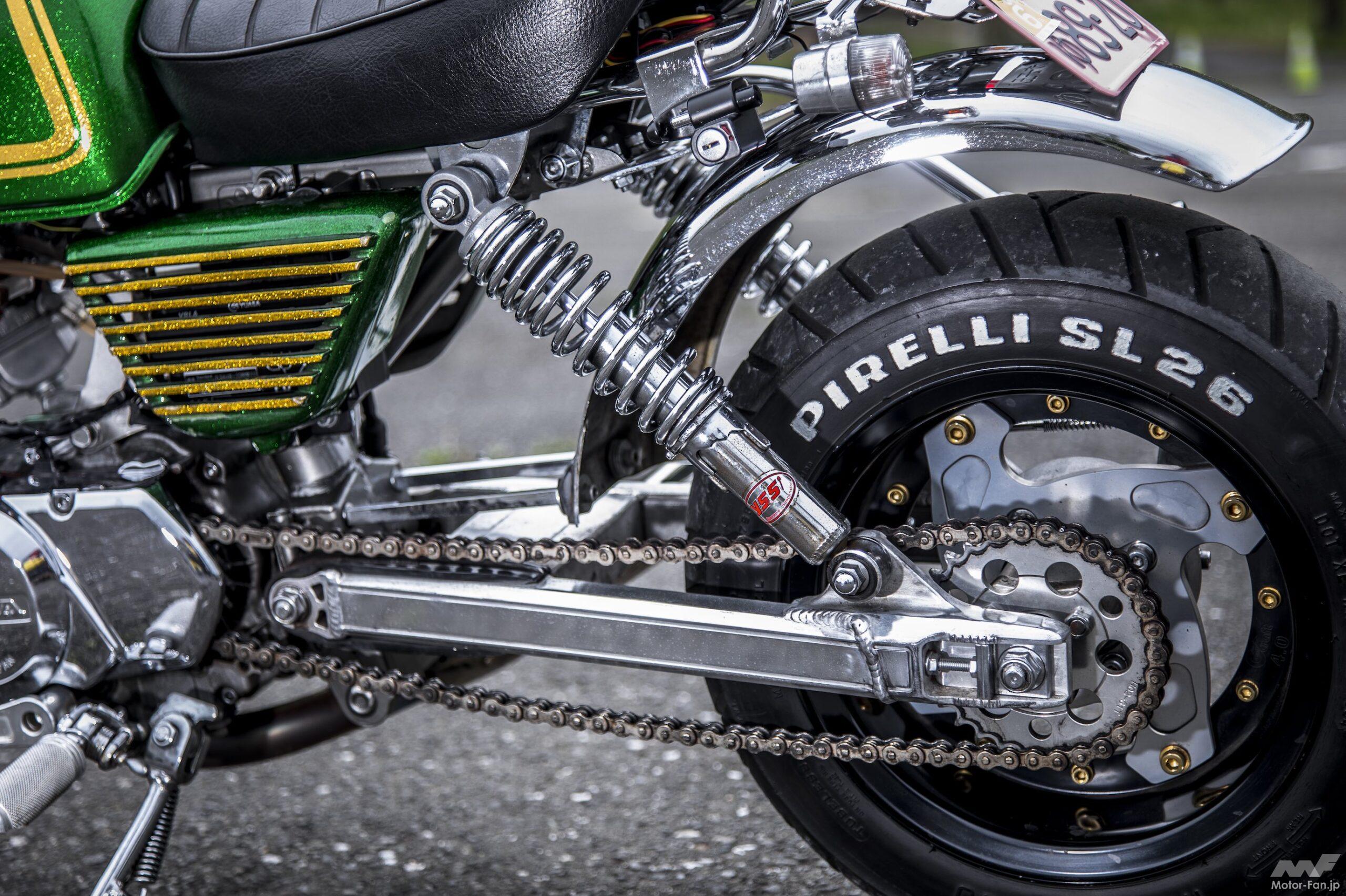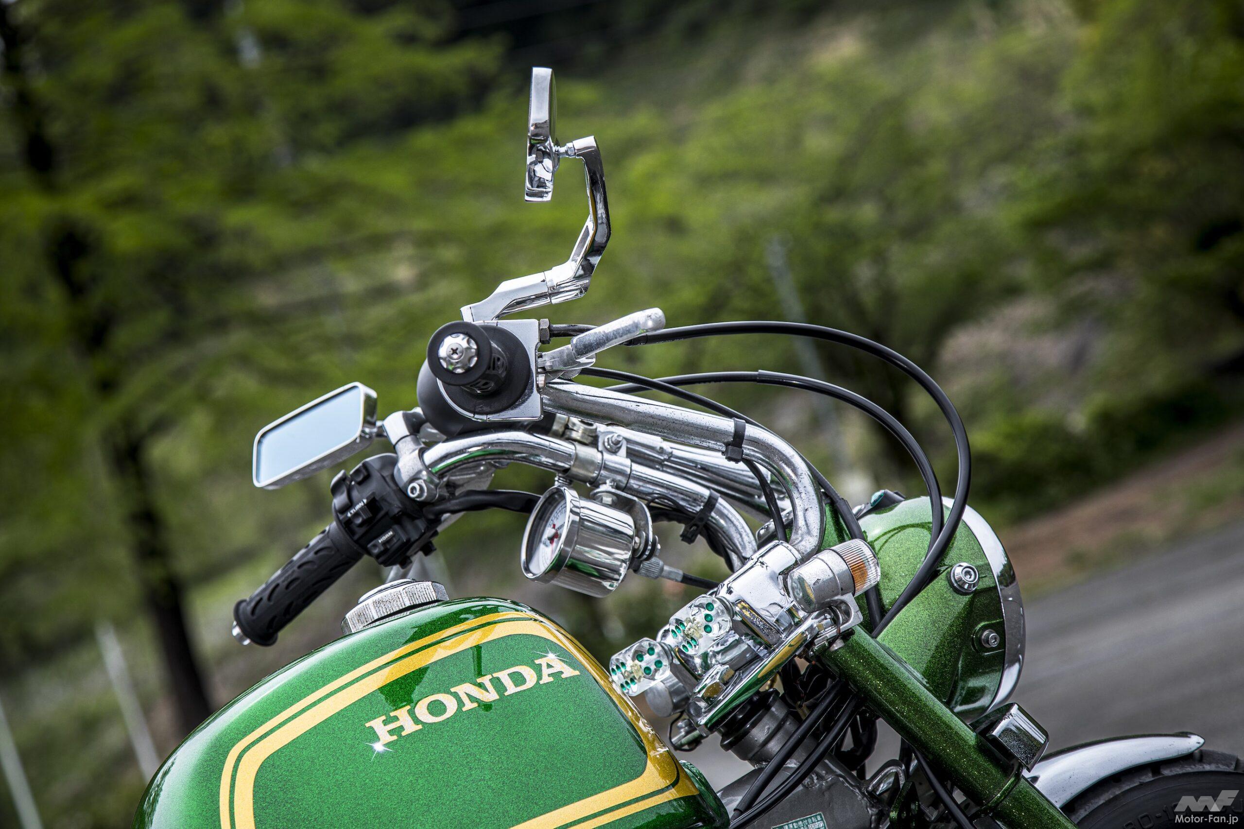 ネックを寝かせてフロントフォークの角度を変えると、フレームを10cm延長していることもあってハンドルが遠くなる。そこでダックス用のハンドルをセットすることで違和感ないポジションとしている。これには全高の低さを演出する意味もあり、絞った形状はレトロさも生み出している。足元には4J×10インチのホイールを組み合わせて、110/80-10と太いタイヤを履かせた。チューニングマシンであると感じさせるワイドタイヤだが、そのままにはせずホワイトレターを自ら筆さしで施した。これもレトロさを引き出す演出だ。
