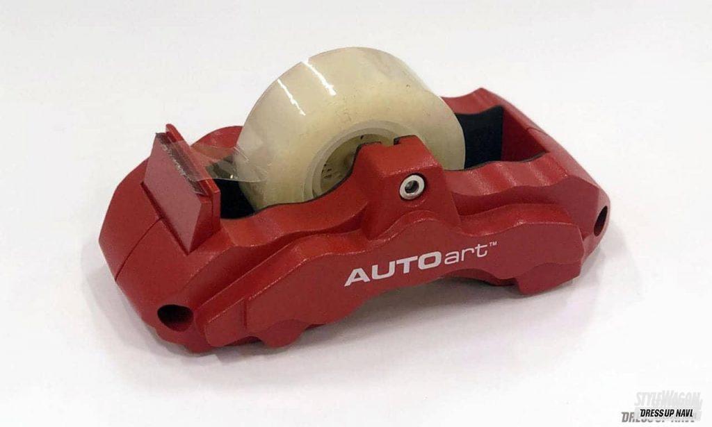 興味深いアイテム。ソレがコレ、ブレーキキャリパーです。……って違います。ブレーキキャリパーを模したテープディスペンサー(テープカッター)です。かなり入念に作り込まれていて、テープの回転軸部のピンの魅せ方は、とりわけ雰囲気を高めてくれます。対向6ポットを連想させる形状、レーシームード満点の真っ赤なボディ等々、スポーツカー好きをニッコリさせる要素満載のステーショナリーグッズと言えるでしょう。