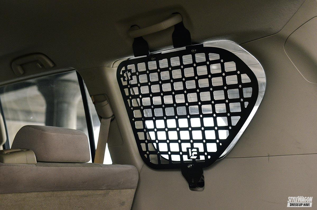 末端のサイドガラスの内側に、アシストグリップとトノカバーの固定部を使って吊り下げるラックを用意。空間を無駄なく利用できる便利パーツだ。150プラド全車に装着可能。スチール製。左右セット販売。