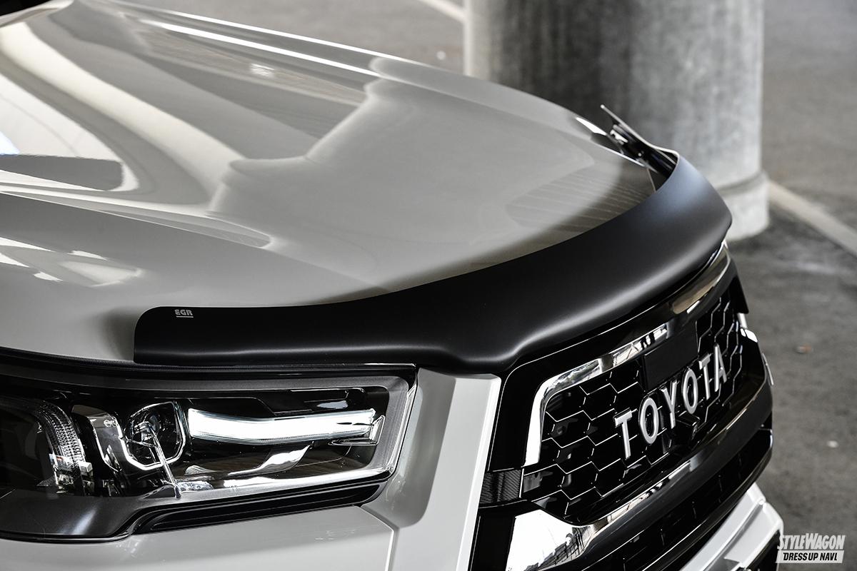 ハイラックス”GR SPORTS”には、50年近い歴史を誇るオーストラリアのパーツメーカー、EGRのバグガードを装着。スマートなデザインと品質の高さがその特徴で、高速走行時の虫除けに大きな効果を発揮してくれます。またラダーフレームでは、エアプレックスのバグガードも取り扱い。ニュージーランドの大手メーカーで、世界30ヵ国以上で展開されている信頼度の高いアイテムです。他にも魅力的なインポートパーツを幅広く取り扱うため、要注目です。