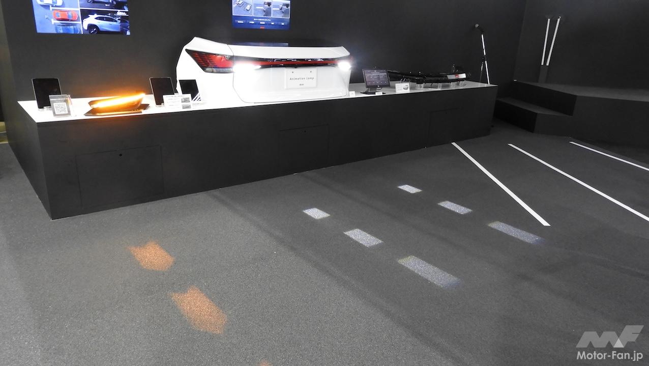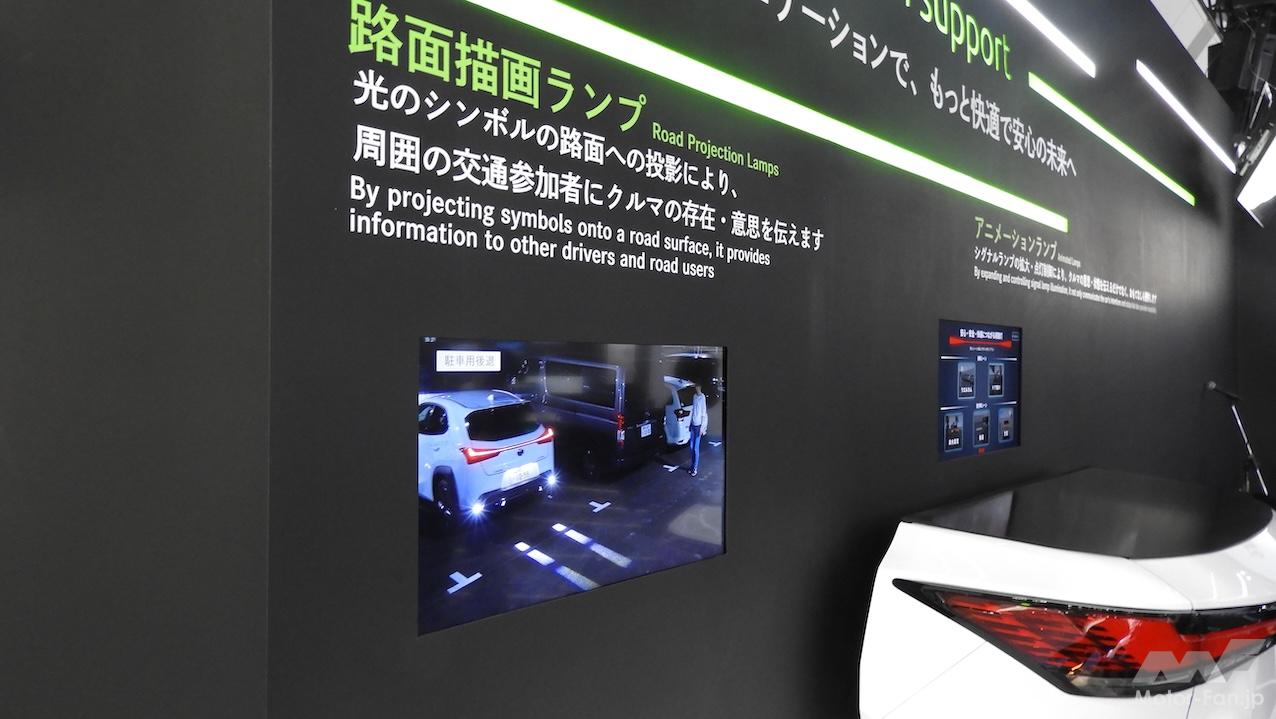 「コミュニケーションサポート」の領域は、人とクルマのつながりを密にするライティング技術群だ。「標識灯路面描画ランプ」は、ターンランプやバックアップランプから路面上に光のパターンを表示することで、自車の動きを周囲の人やクルマに知らせるもの。交差点や駐車場などで威力を発揮し、歩行者の巻き込みや出会い頭の事故防止に貢献する。