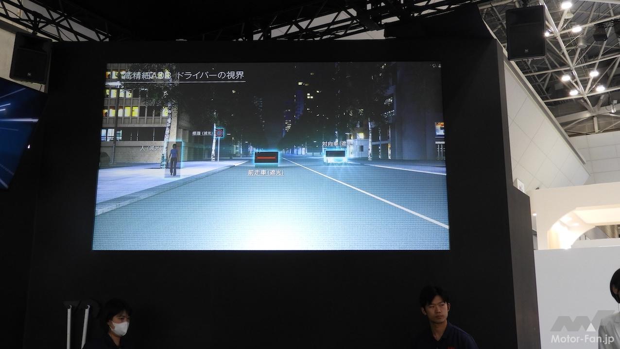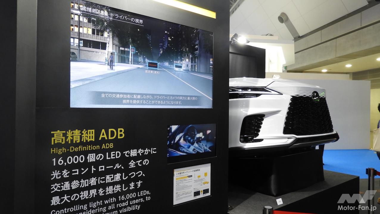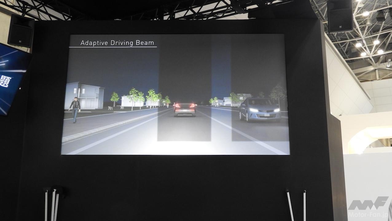 まずは、「ドライバーサポート」の領域から、「高精細ADB(Adaptive Driving Beam)」が初公開された。ハイビームの照射範囲を1万6000個に分割して、照射をより緻密にコントロールする技術だ。細分化された1万6000個のLEDの点灯・消灯に加えて、出力光度も制御。従来は12個分割などだからその差は著しい。