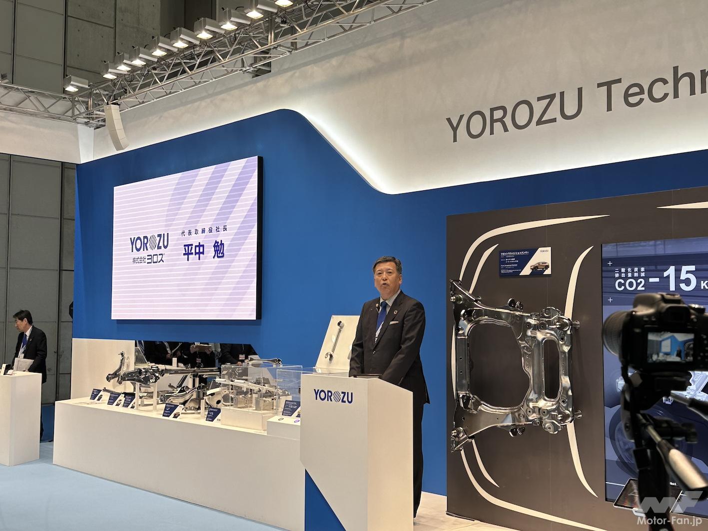10月26日午前のプレスカンファレンスでプレゼンテーションを行なったのは、平中 勉社長だ。ヨロズが注力するのは、軽量化だ。2020年比で2023年度には30%の軽量化を実現する計画が順調に進んでいるという。また、日本で販売されたBEVの80%にヨロズ製品が採用されているという。