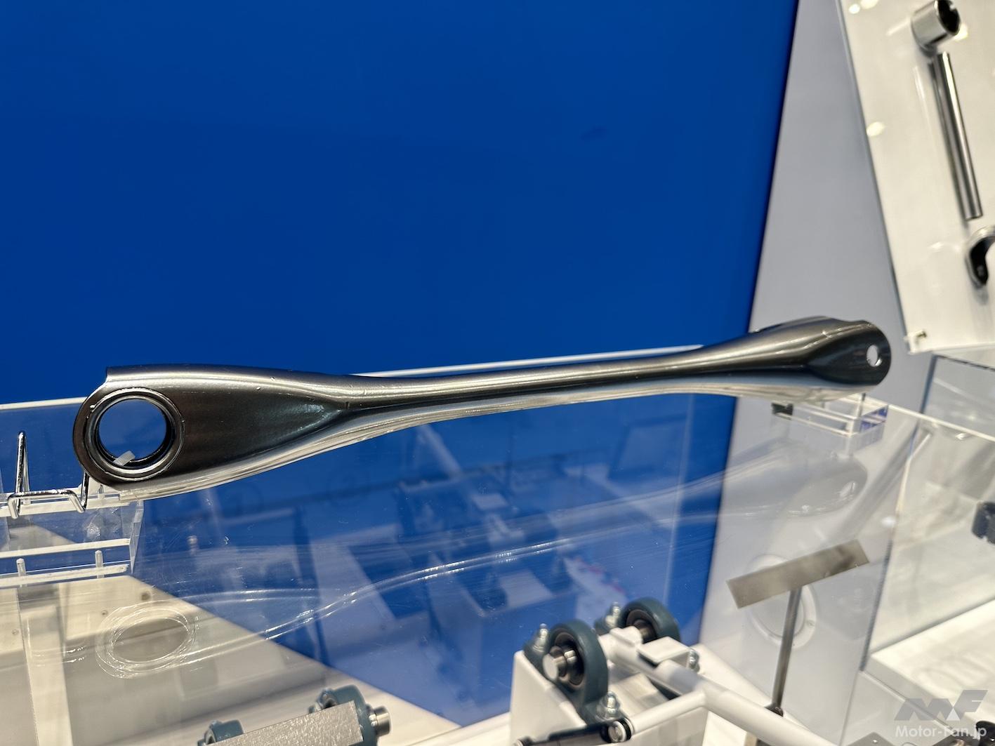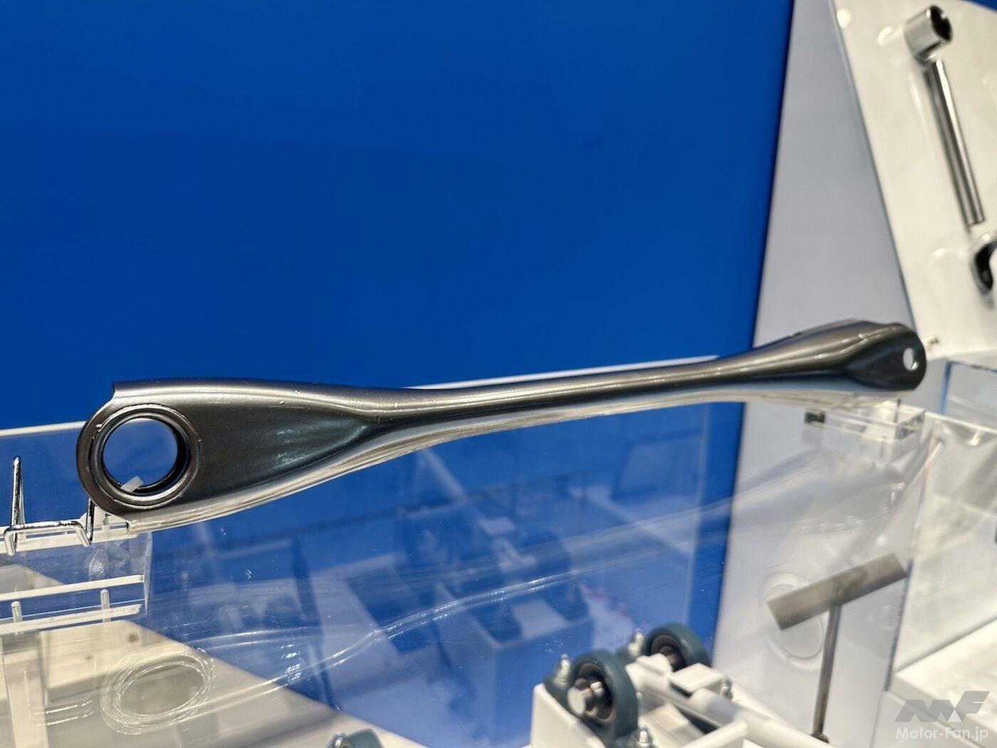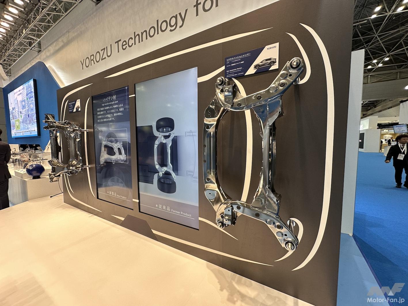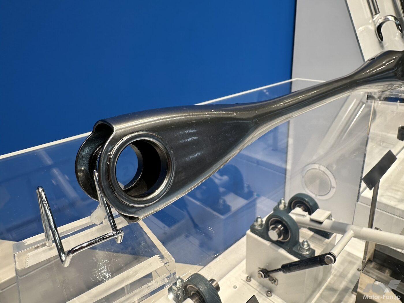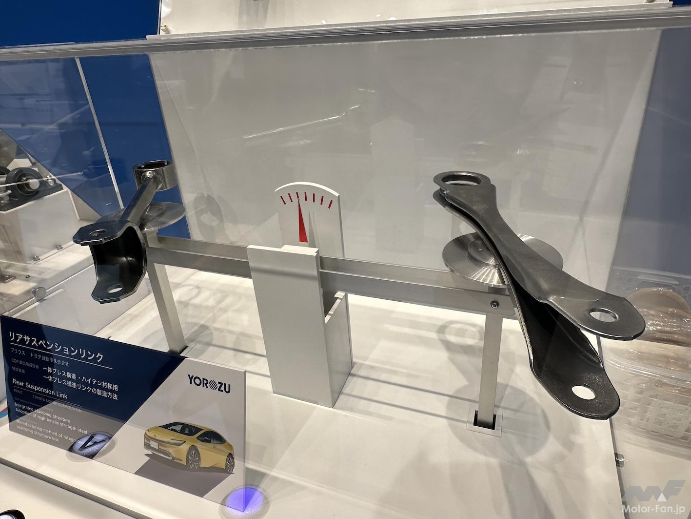 注目は超高張力鋼板(980MPa級)の製品化による軽量化だ。現状、590MPaの高張力鋼板を使った製品はすでに実用化している。ブースには、トヨタ・プリウスのリヤサスペンションリンクが展示されていた。